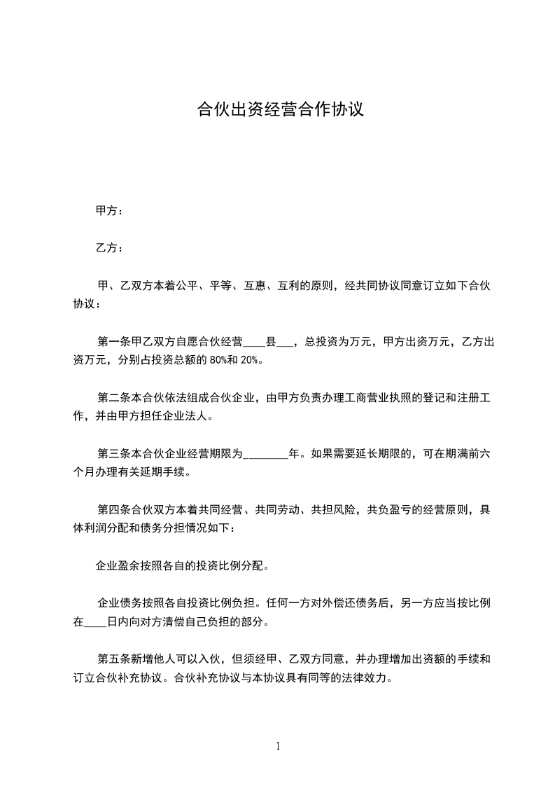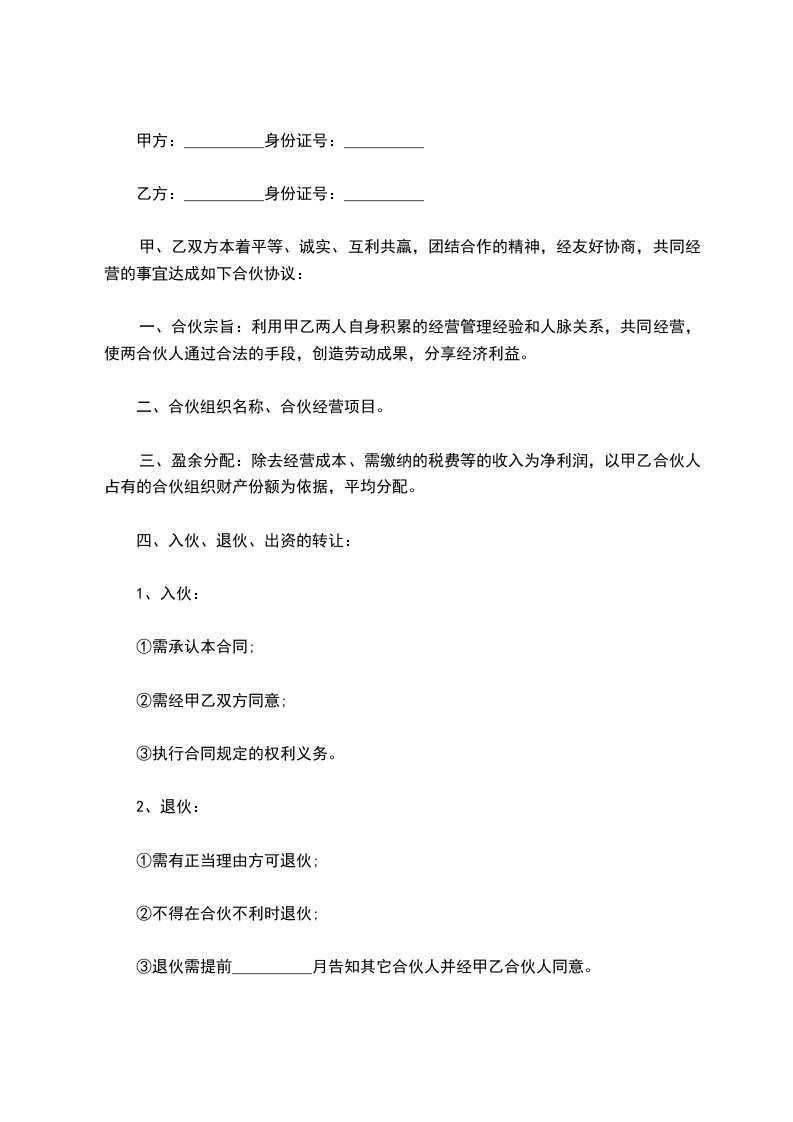 甲、乙双方本着平等、诚实、互利共羸,团结合作的精神,经友好协商,共同经营 的事宜达成如下合伙协议: