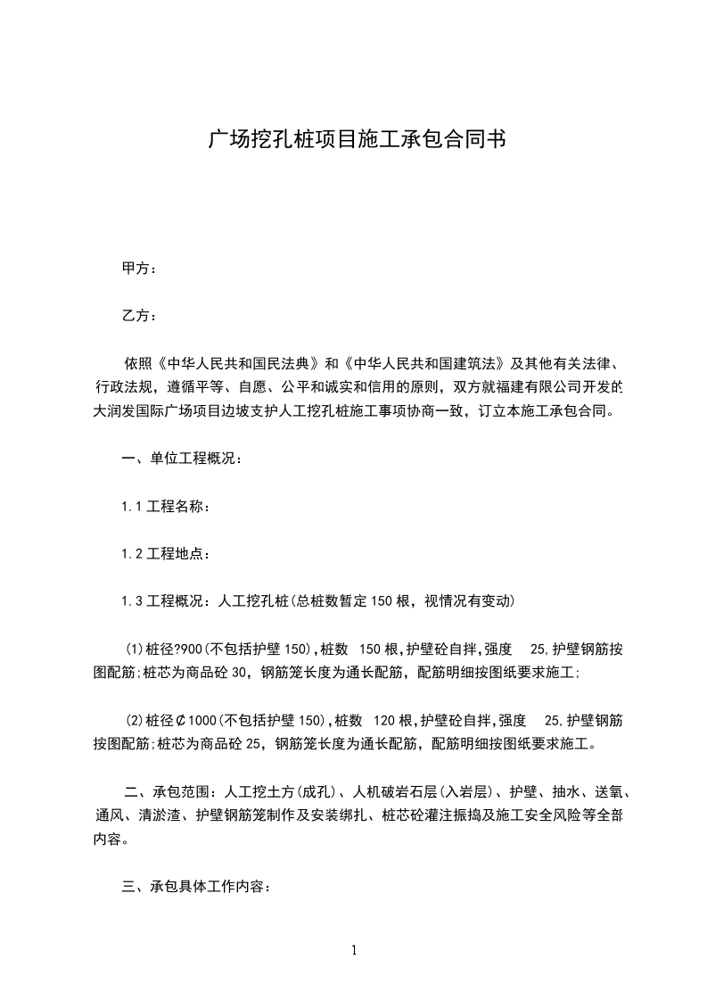 依照《中华人民共和国民法典》和《中华人民共和国建筑法》及其他有关法律、行政法规,遵循平等、自愿、公平和诚实和信用的原则,双方就福建有限公司开发的大润发国际广场项目边坡支护人工挖孔桩施工事项协商一致,订立本施工承包合同。