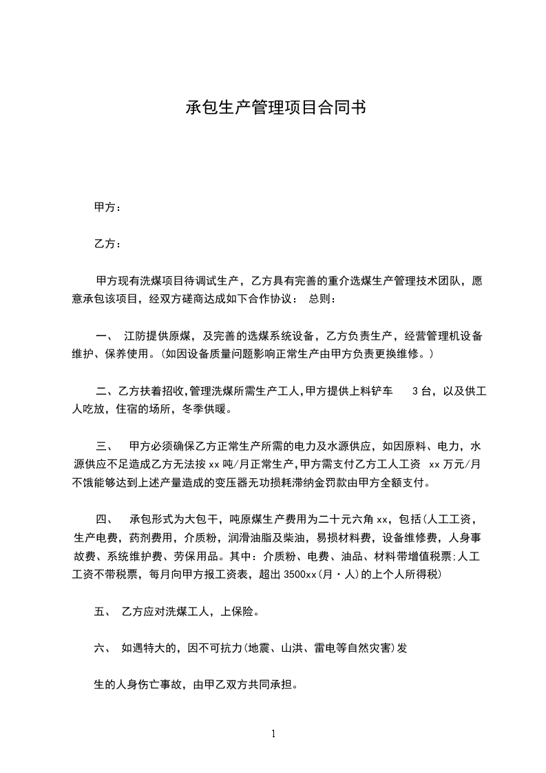 甲方现有洗煤项目待调试生产,乙方具有完善的重介选煤生产管理技术团队,愿意承包该项目,经双方磋商达成如下合作协议: 总则: