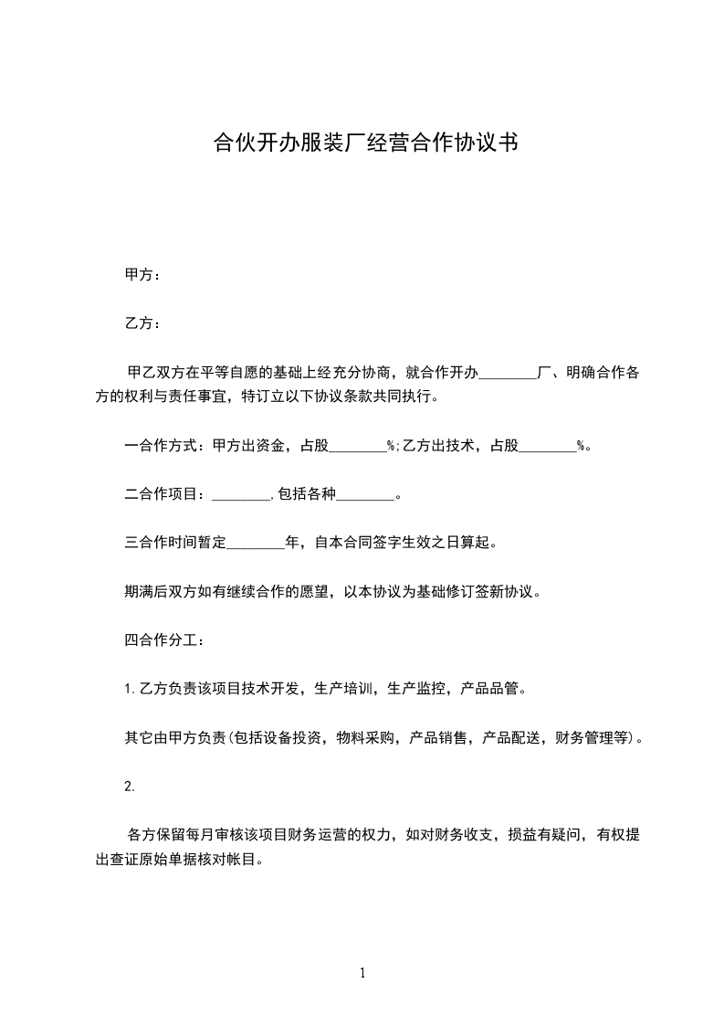甲乙双方在平等自愿的基础上经充分协商,就合作开办________厂、明确合作各方的权利与责任事宜,特订立以下协议条款共同执行。