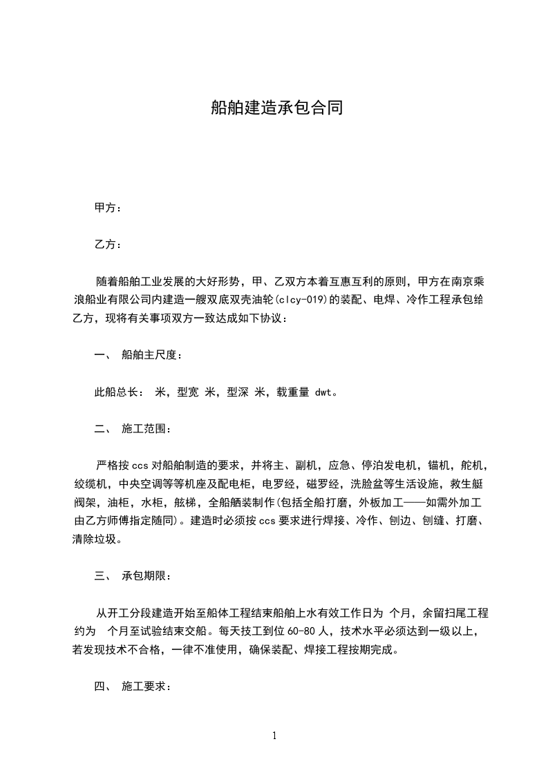 随着船舶工业发展的大好形势,甲、乙双方本着互惠互利的原则,甲方在南京乘浪船业有限公司内建造一艘双底双壳油轮(clcy-019)的装配、电焊、冷作工程承包给乙方,现将有关事项双方一致达成如下协议: