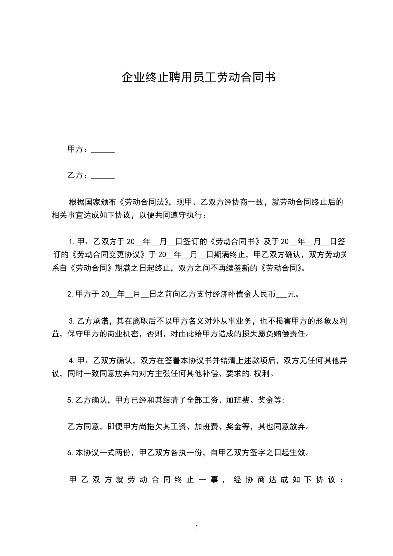 一、乙方于______年______月______日与甲方签订的劳动合同,该劳动合同期限为______年______月______日至______年______月______日。现经双方友好协商,双方同意不再续订劳动合同,并于______年______月______日终止该劳动合同,双方之前的劳动关系终止。