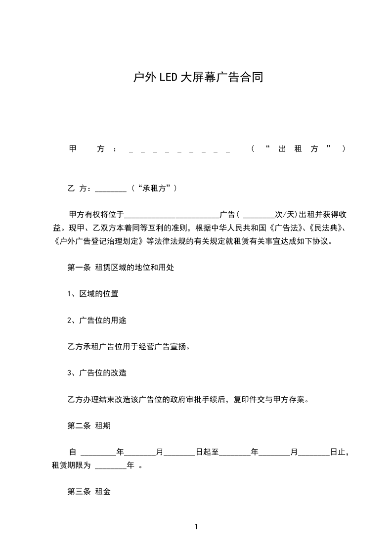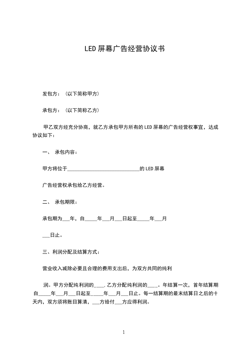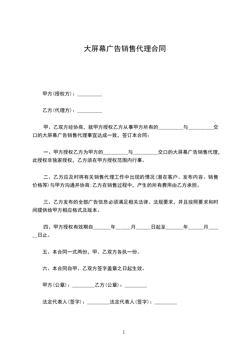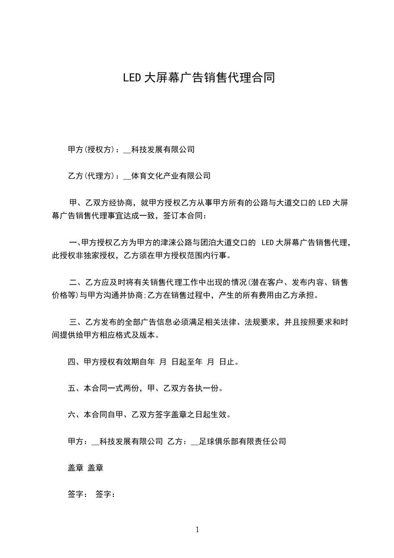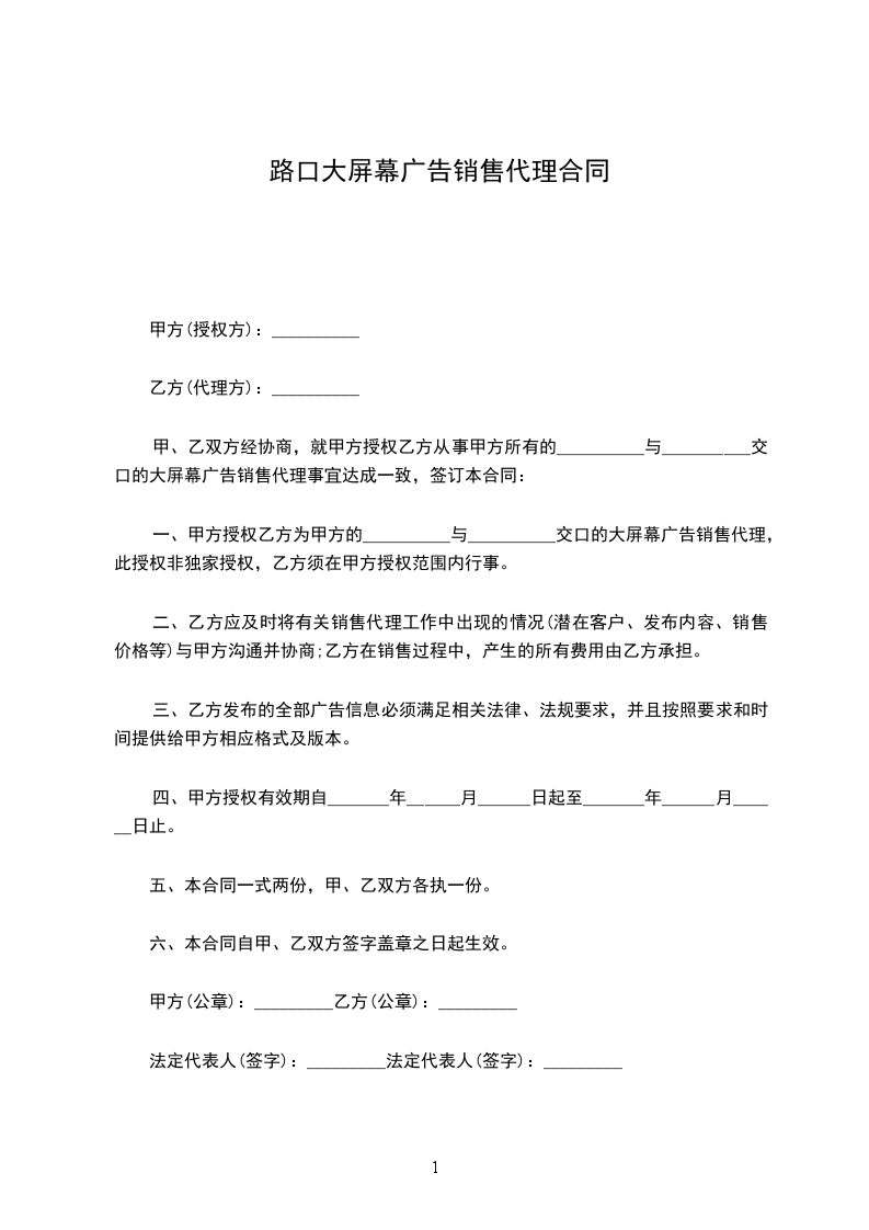 甲、乙双方经协商,就甲方授权乙方从事甲方所有的公路与大道交口的LED大屏幕广告销售代理事宜达成一致,签订本合同: