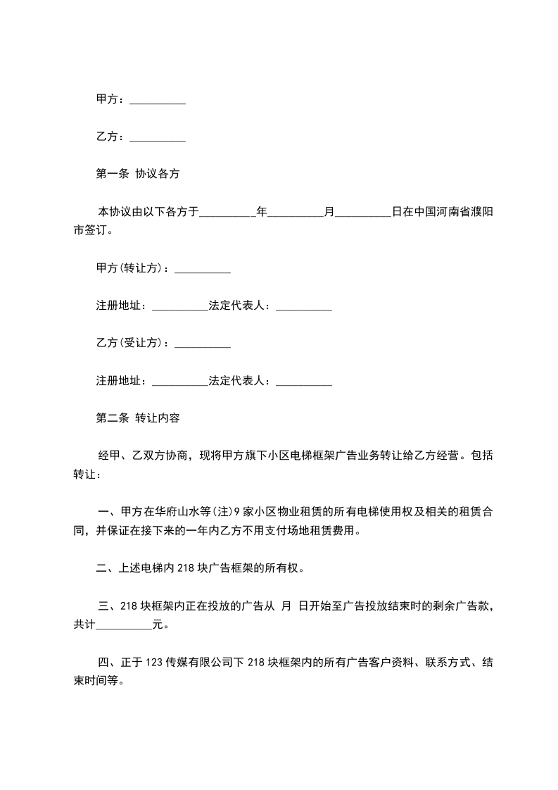 经甲、乙双方协商,现将甲方旗下小区电梯框架广告业务转让给乙方经营。包括转让: