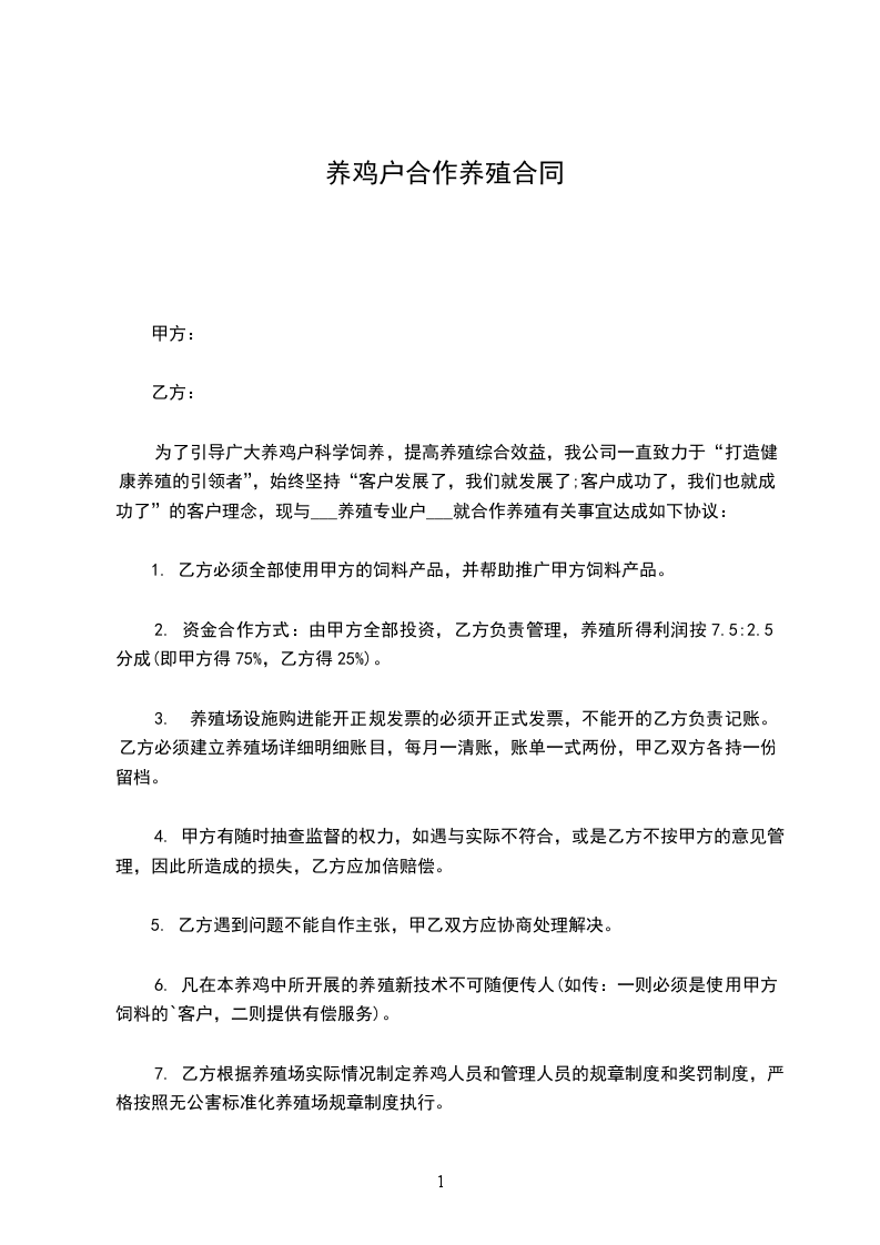 2. 资金合作方式:由甲方全部投资,乙方负责管理,养殖所得利润按7.5:2.5分成(即甲方得75%,乙方得25%)。