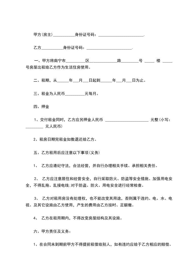 一、甲方将南宁市__________区______________路_________号 _____ 楼 _____号房屋出租给乙方作为生活住房使用。