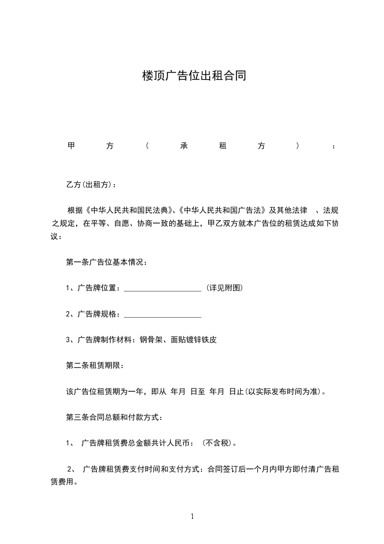 根据《中华人民共和国民法典》、《中华人民共和国广告法》及其他法律 、法规之规定,在平等、自愿、协商一致的基础上,甲乙双方就本广告位的租赁达成如下协议: