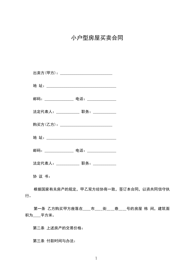 第一条 乙方购买甲方座落在____市____街____巷____号的房屋 栋 间,建筑面积为____平方米。