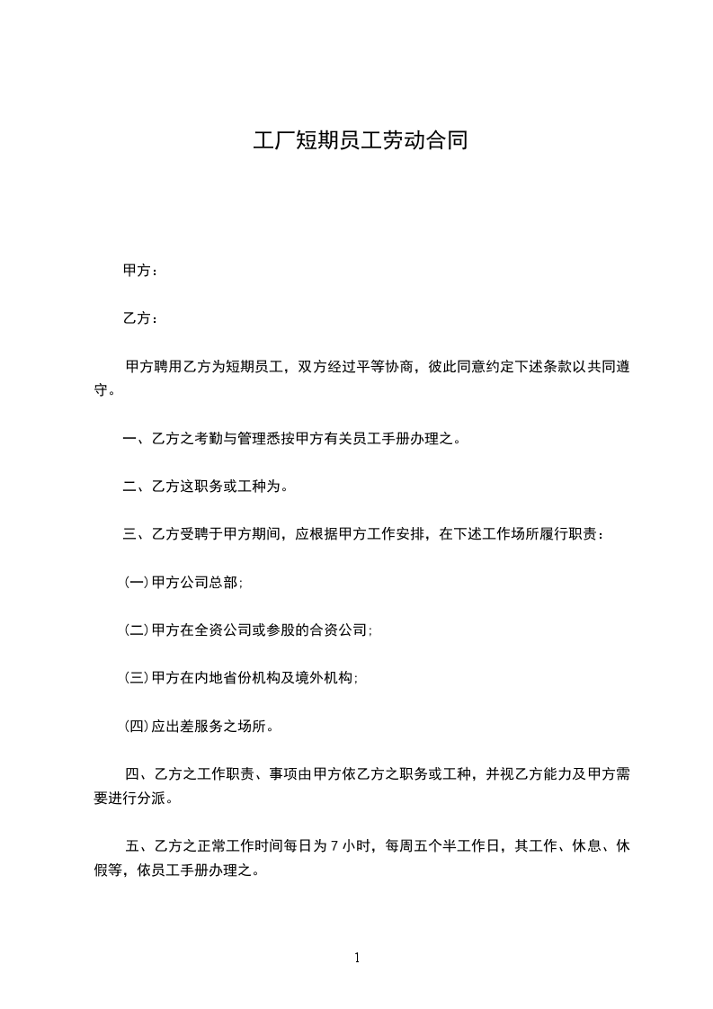甲方聘用乙方为短期员工,双方经过平等协商,彼此同意约定下述条款以共同遵守。