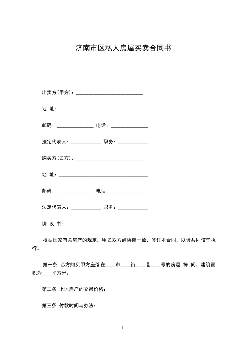 第一条 乙方购买甲方座落在____市____街____巷____号的房屋 栋 间,建筑面积为____平方米。