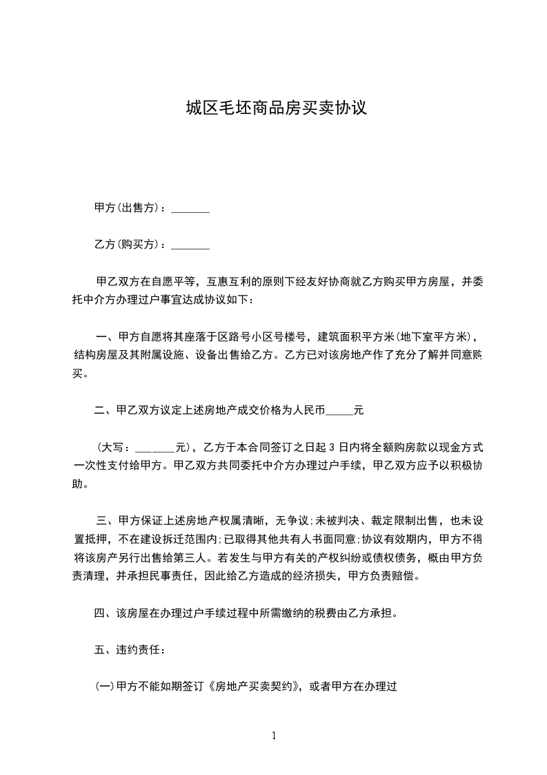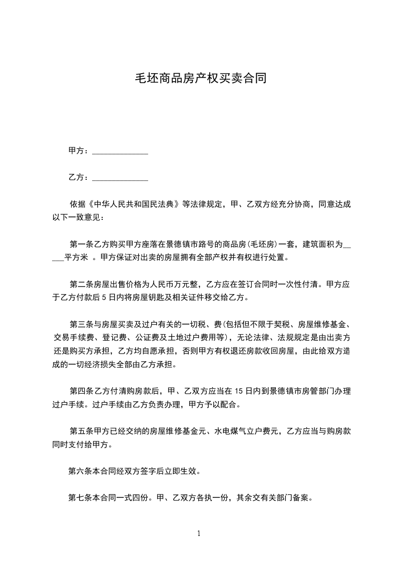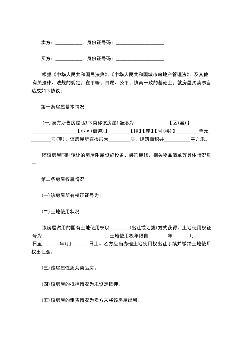 第一条 乙方购买甲方座落在____市____街____巷____号的房屋 栋 间,建筑面积为____平方米。