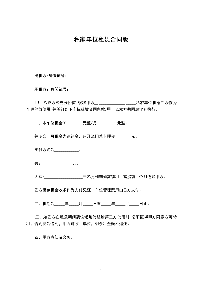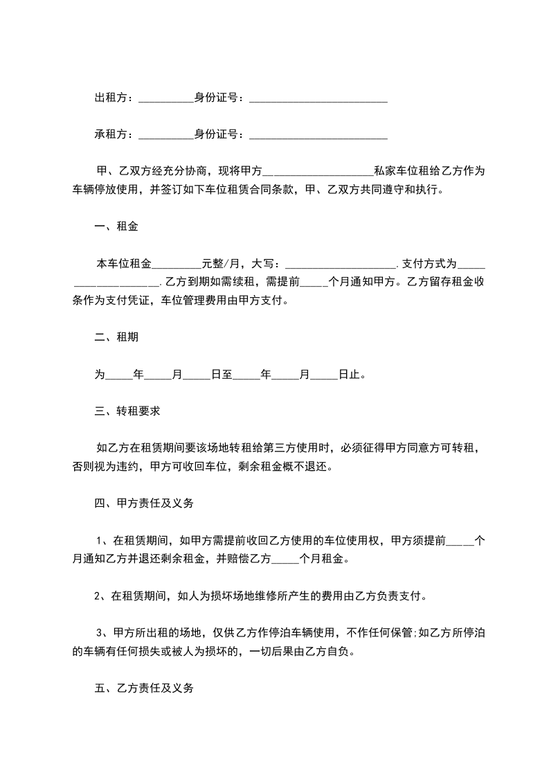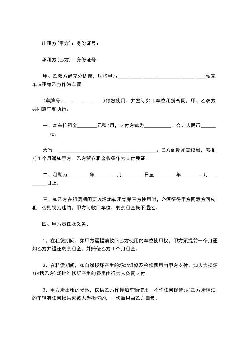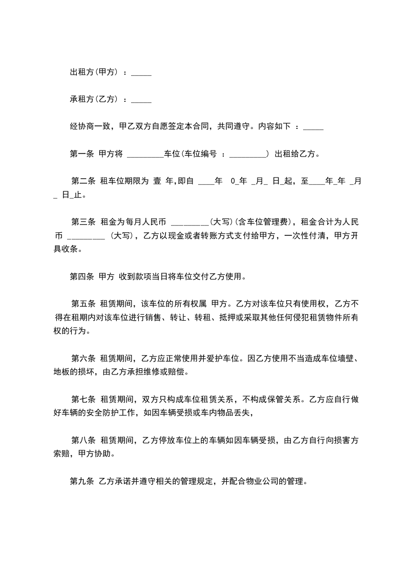 (车牌号:_______________)停放使用,并签订如下车位租赁合同,甲、乙双方共同遵守和执行。