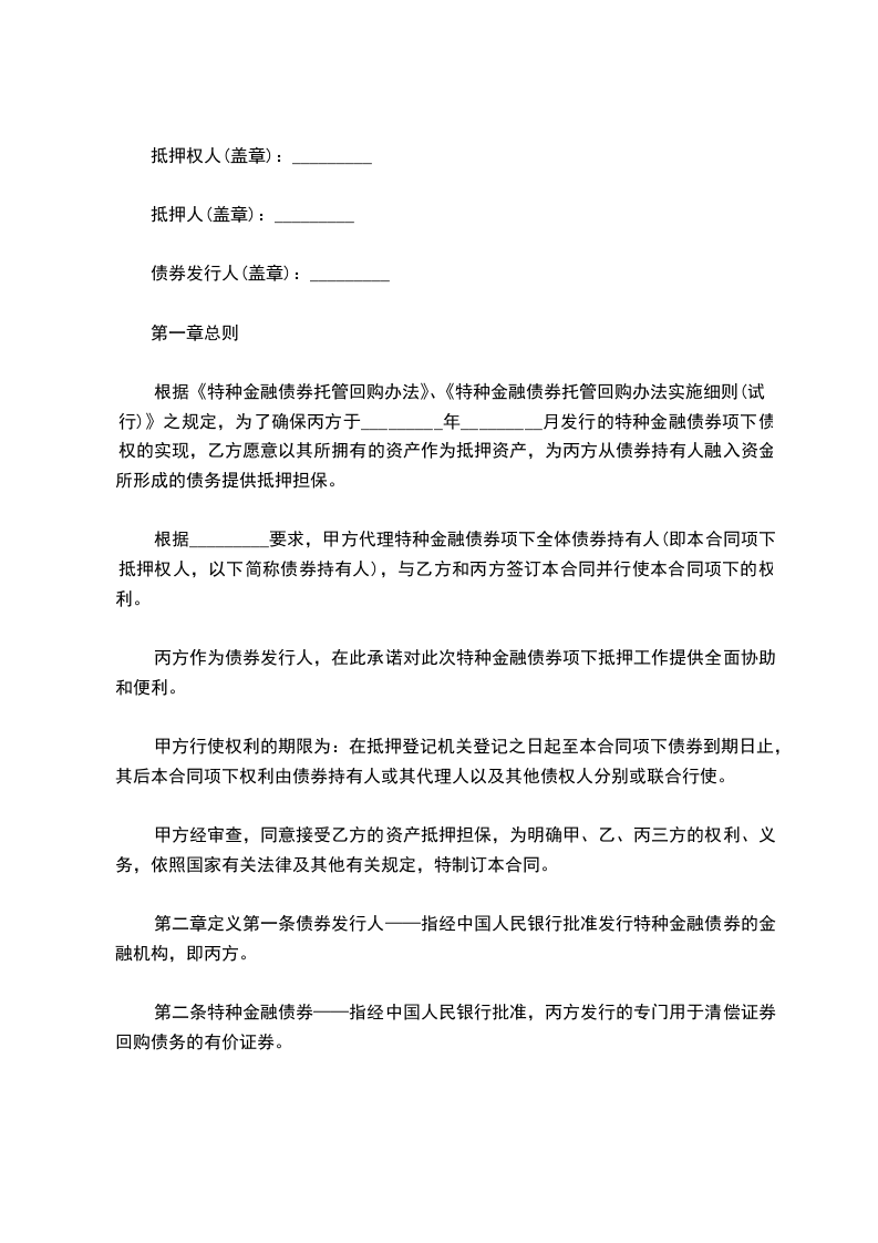 根据《特种金融债券托管回购办法》、《特种金融债券托管回购办法实施细则(试行)》之规定,为了确保丙方于_________年_________月发行的特种金融债券项下债权的实现,乙方愿意以其所拥有的资产作为抵押资产,为丙方从债券持有人融入资金所形成的债务提供抵押担保。