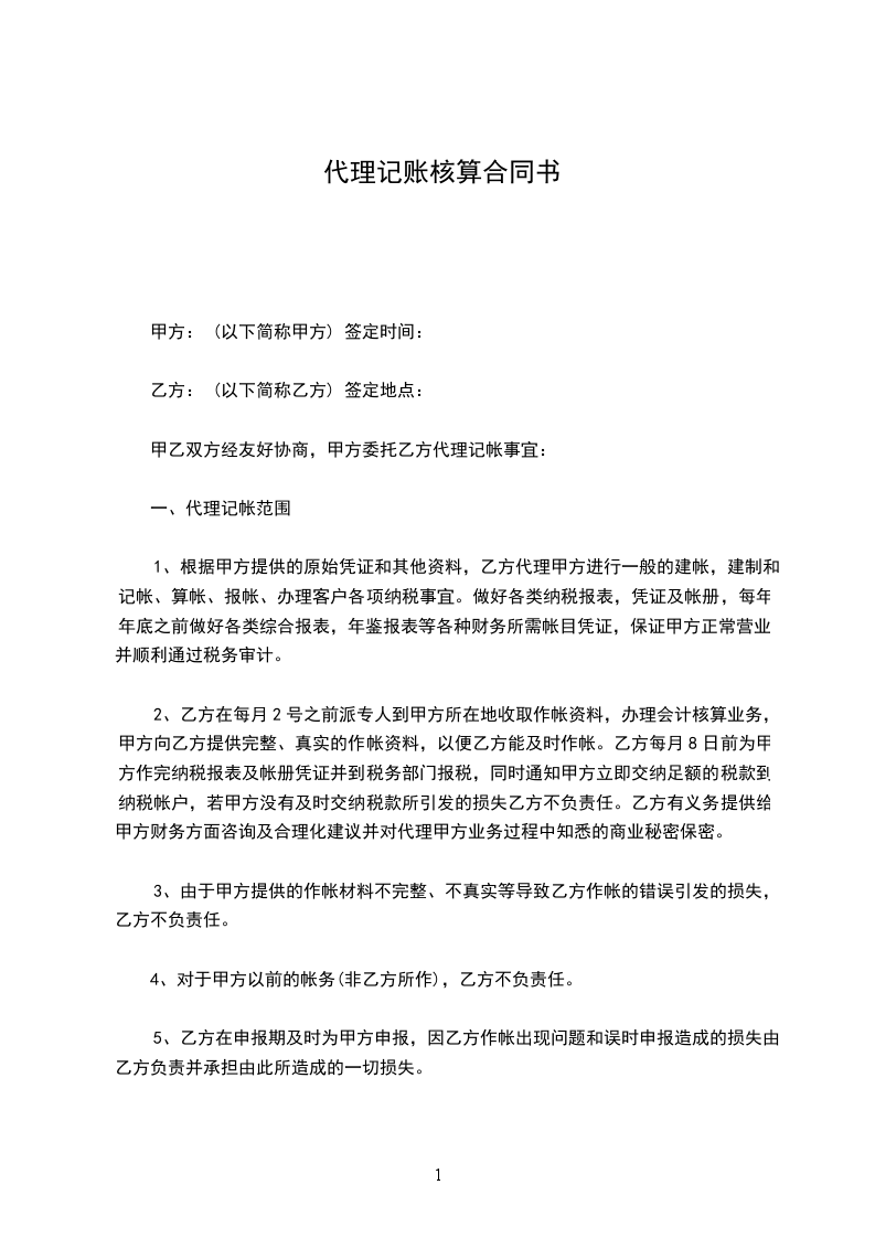 1、乙方在作帐过程中造成的作帐错误、作帐资料丢失等原因,为甲方带来损失由乙方负责并承担由此所造成的一切损失,甲方有终止本协议的权利并不视为违约。