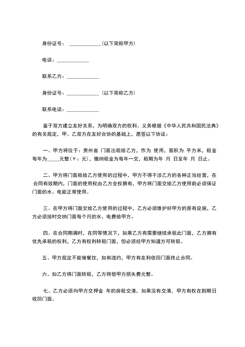 根据《中华人民共和国民法典》相关规定,经双方友好协商,就甲方将其拥有的门面房出租给乙方一事, 达成如下协议: