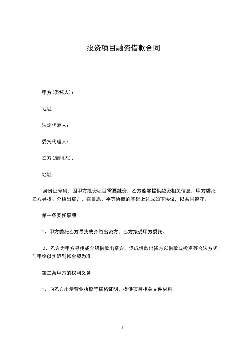 身份证号码:因甲方投资项目需要融资,乙方能够提供融资相关信息,甲方委托乙方寻找、介绍出资方,在自愿、平等协商的基础上达成如下协议,以共同遵守。
