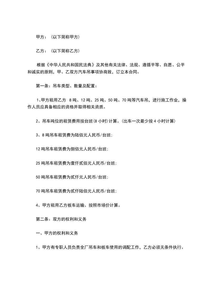 根据《中华人民共和国民法典》及其他有关法律、法规、遵循平等、自愿、公平和诚实的原则,甲、乙双方汽车吊事项协商致,订立本合同。