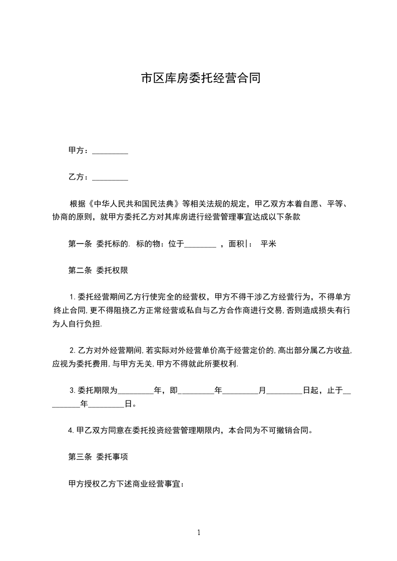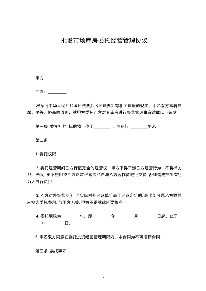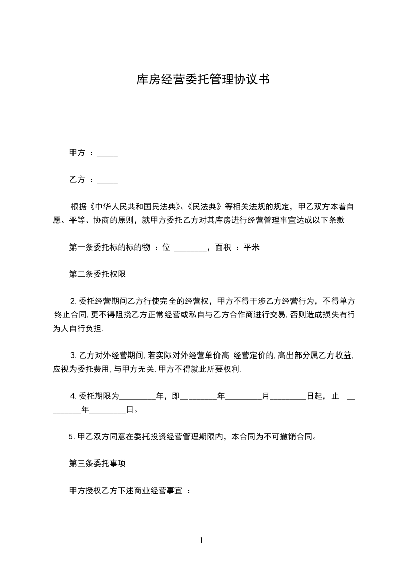 根据《中华人民共和国民法典》、《民法典》等相关法规的规定,甲乙双方本着自愿、平等、协商的原则,就甲方委托乙方对其库房进行经营管理事宜达成以下条款