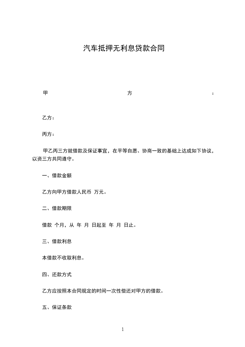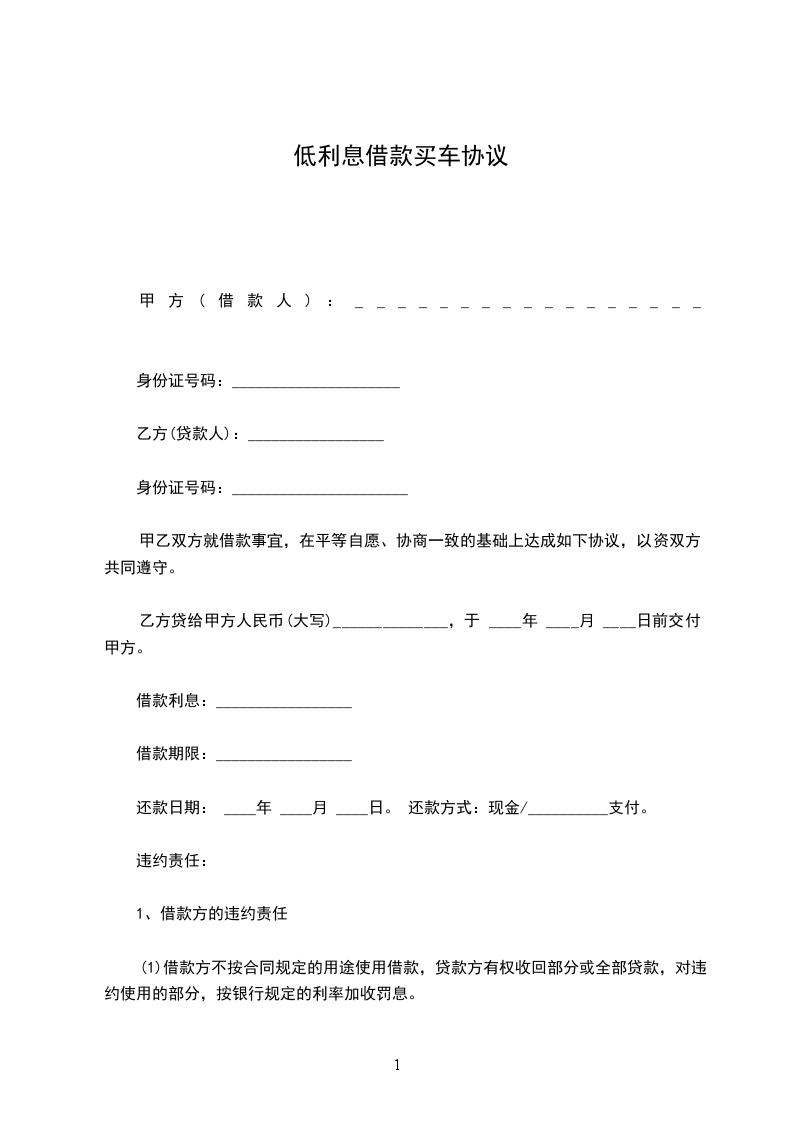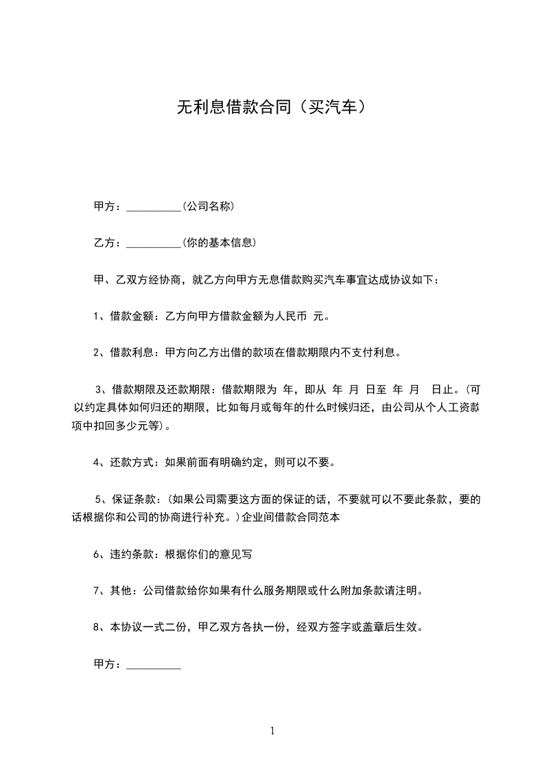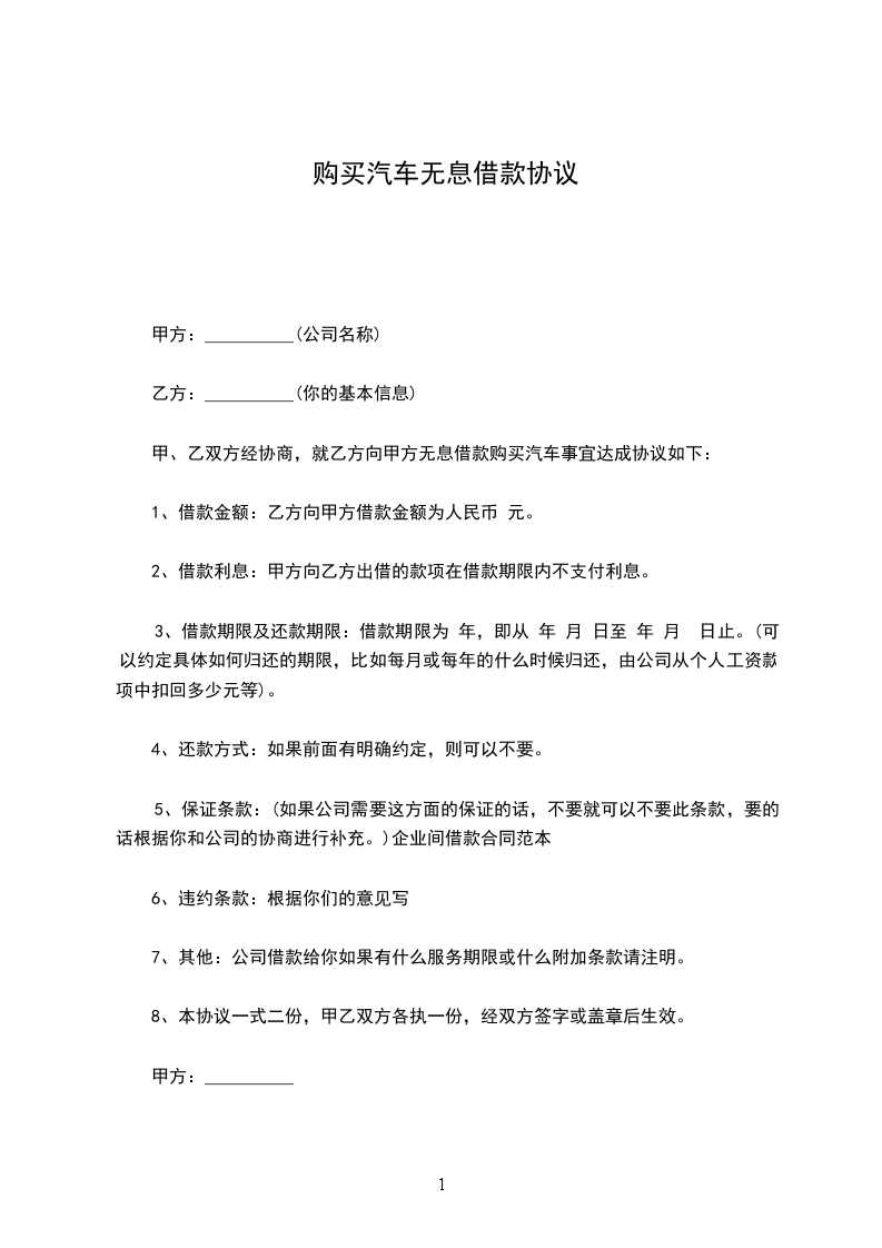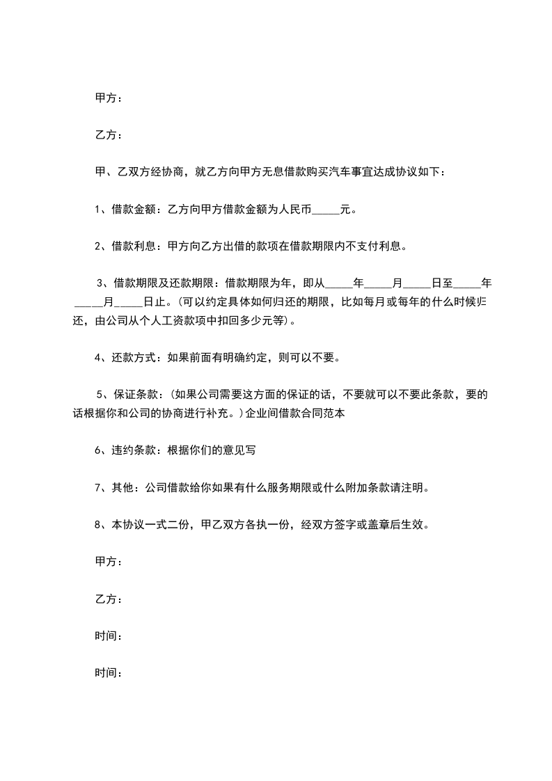 甲、乙双方经协商,就乙方向甲方无息借款购买汽车事宜达成协议如下: