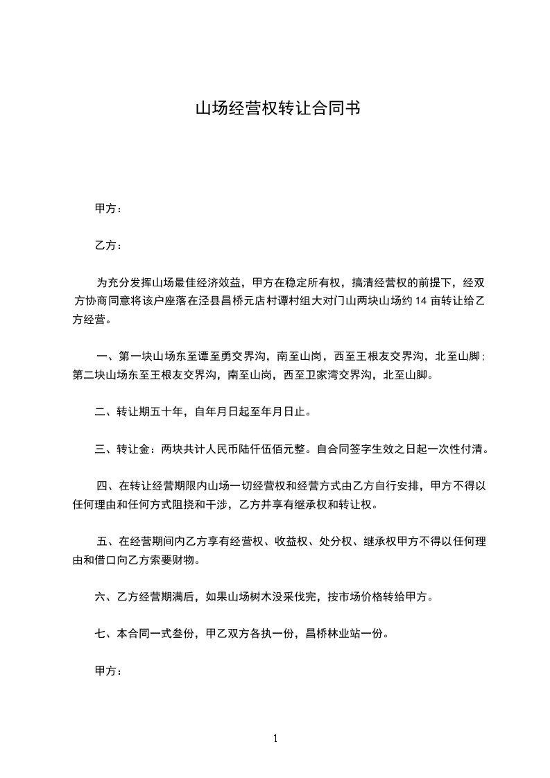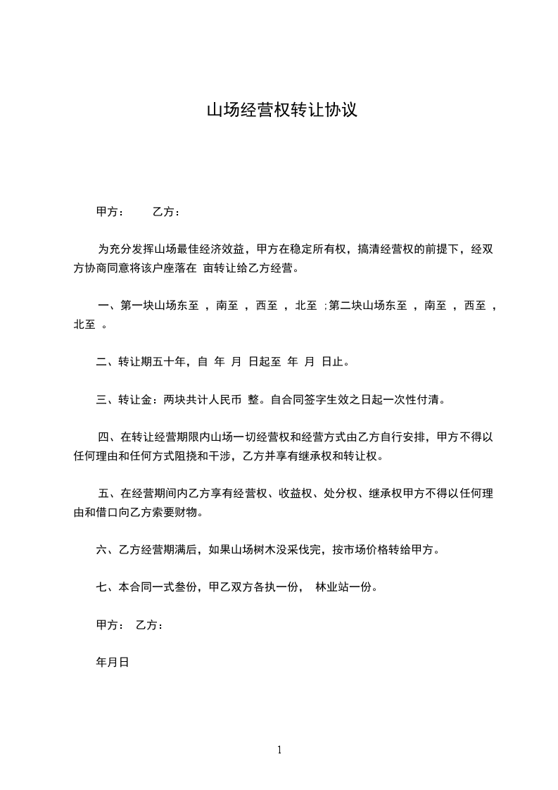为充分发挥山场最佳经济效益,甲方在稳定所有权,搞清经营权的前提下,经双方协商同意将该户座落在 山场约 亩转让给乙方经营。