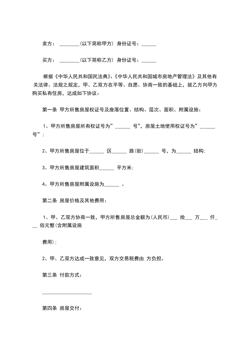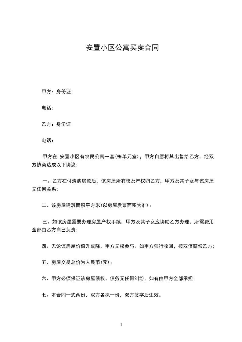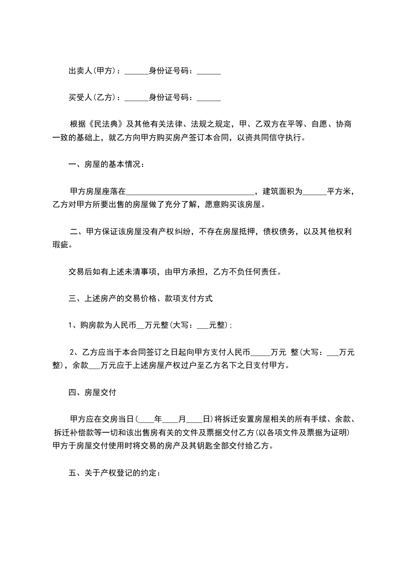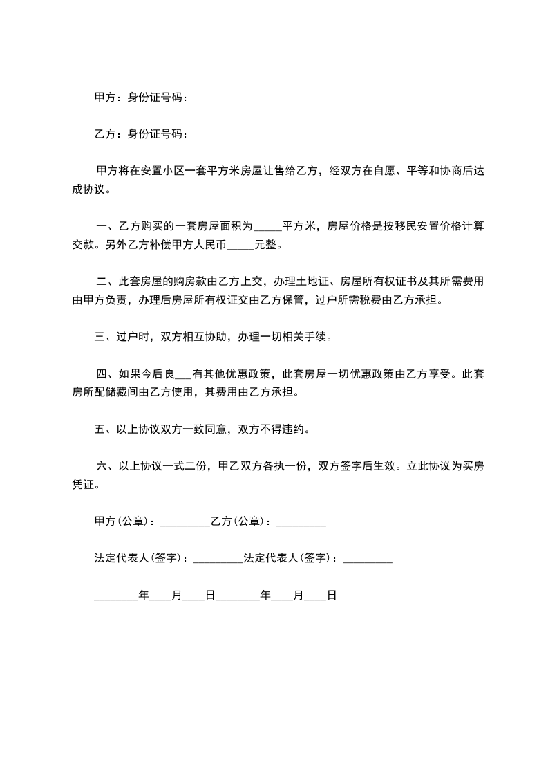 一、乙方购买的一套房屋面积为_____平方米,房屋价格是按移民安置价格计算交款。另外乙方补偿甲方人民币_____元整。