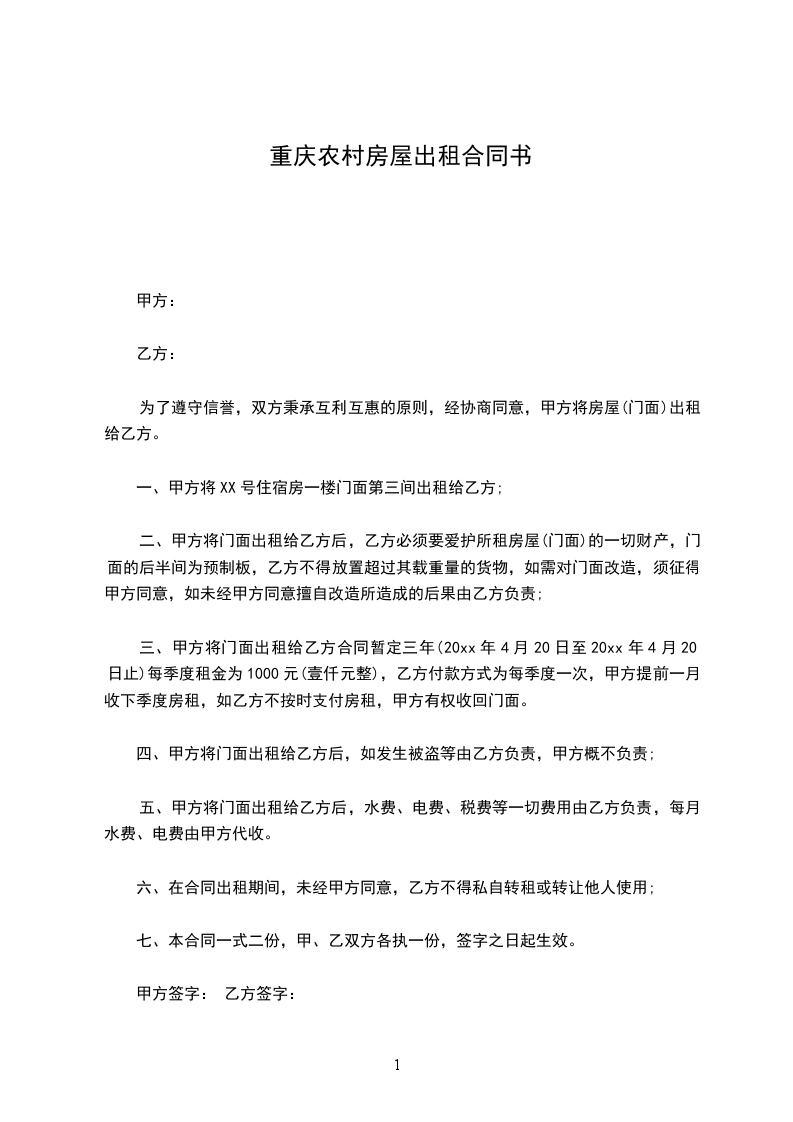 一、甲方将XX号住宿房一楼门面第三间出租给乙方;