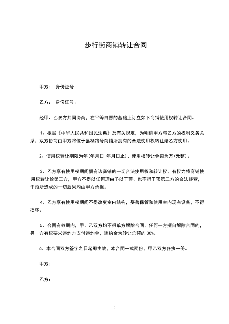 1、根据《中华人民共和国民法典》及有关规定,为明确甲方与乙方的权利义务关系,双方协商由甲方将位于县栖路号商铺所拥有的合法使用权转让给乙方使用。