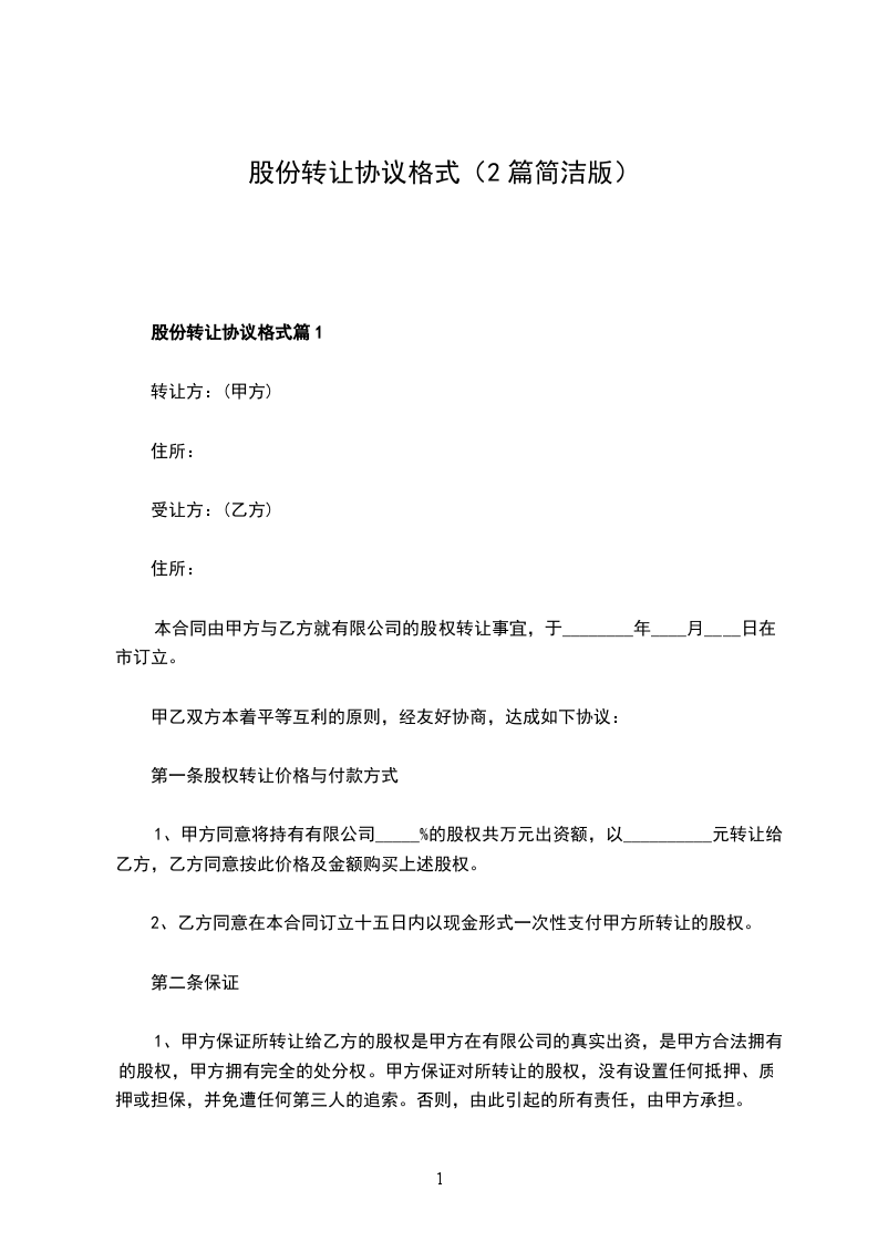 一、转让方将其在__________________公司(以下简称公司)_______%的股份(人民币_________元)依法转让给受让方。