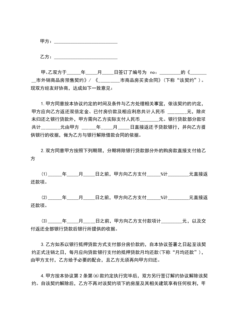 1.甲方同意按本协议约定的时间及条件与乙方处理相关事宜,依该契约的约定,甲方应向乙方返还双倍定金、已付房价款及相应利息共计人民币 ________元,除尚未归还之银行贷款外,甲方需向乙方实际支付人民币________元。银行贷款部分款项共计________元由甲方 ______年_____月_____日直接返还予贷款银行,并向乙方提供银行的收据,做为乙方与银行解除借款合同的依据。