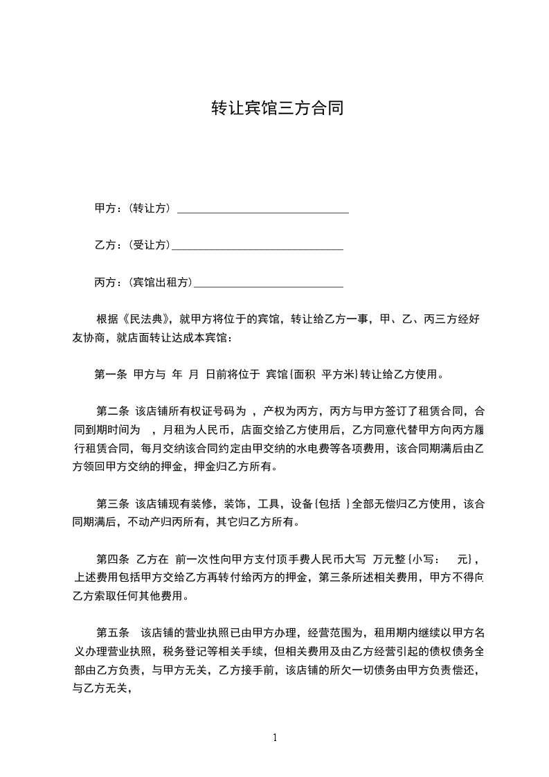 根据《民法典》,就甲方将位于的宾馆,转让给乙方一事,甲、乙、丙三方经好友协商,就店面转让达成本宾馆: