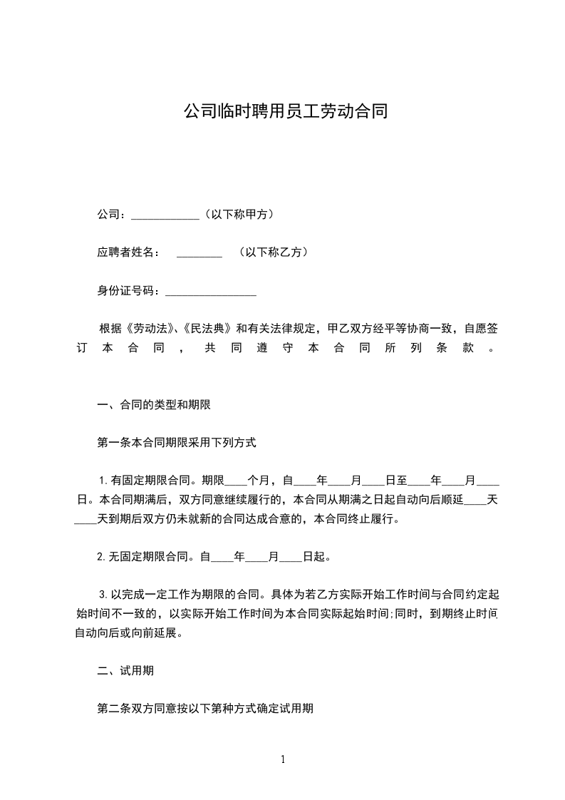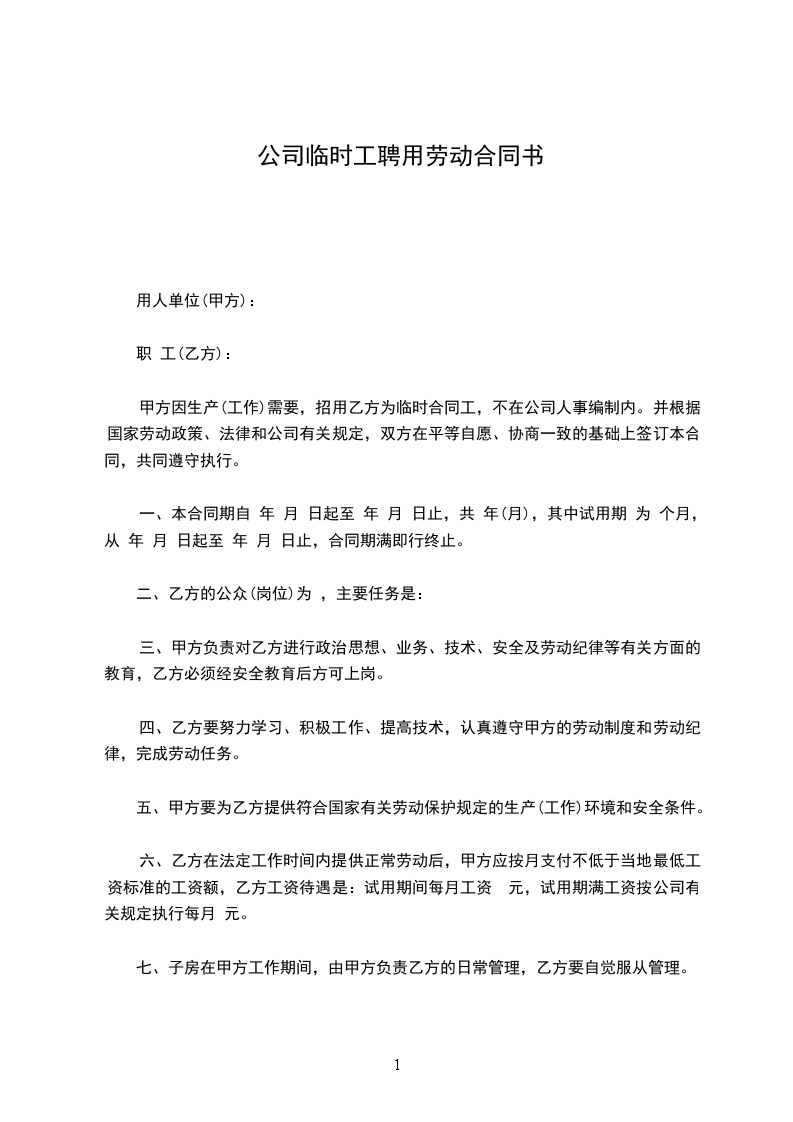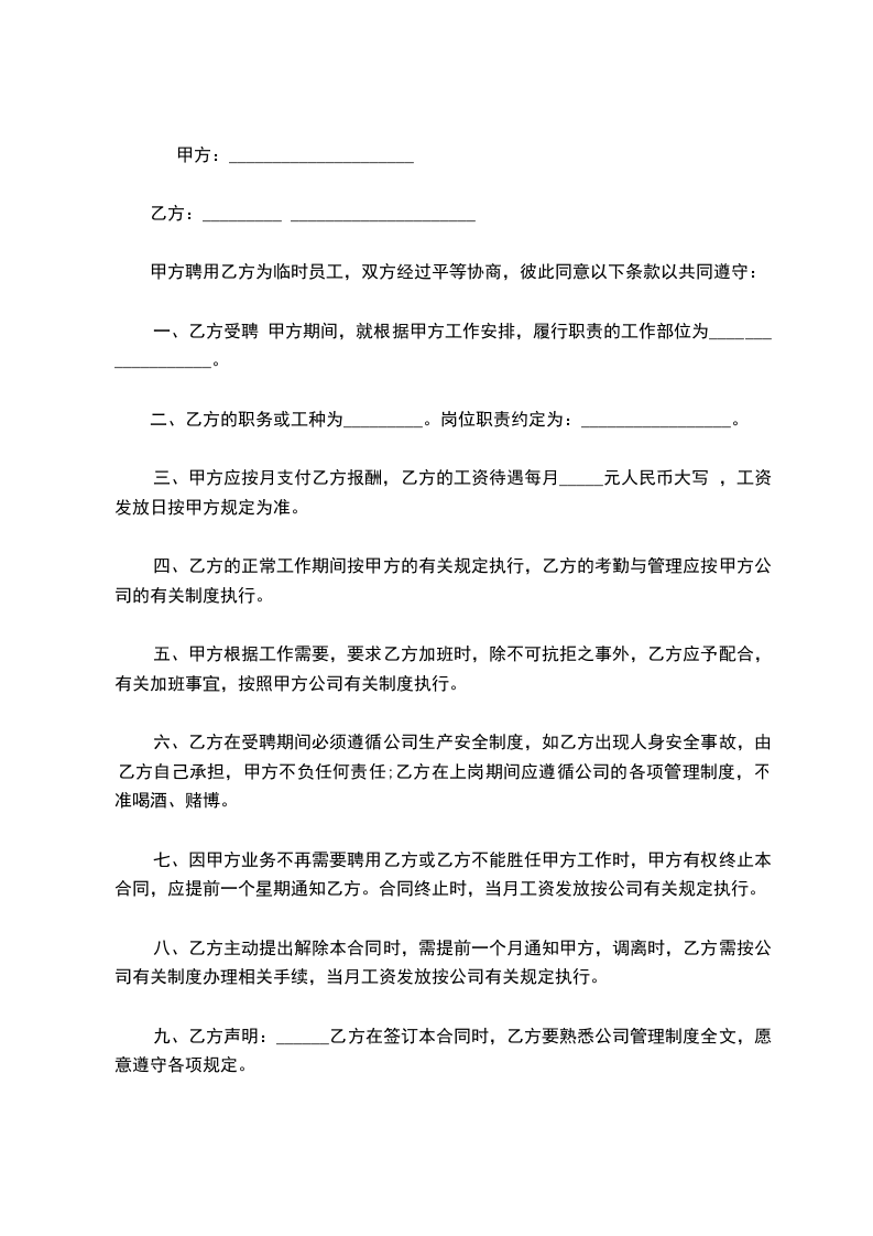 甲方因生产(工作)需要,招用乙方为临时合同工,不在公司人事编制内。并根据国家劳动政策、法律和公司有关规定,双方在平等自愿、协商一致的基础上签订本合同,共同遵守执行。