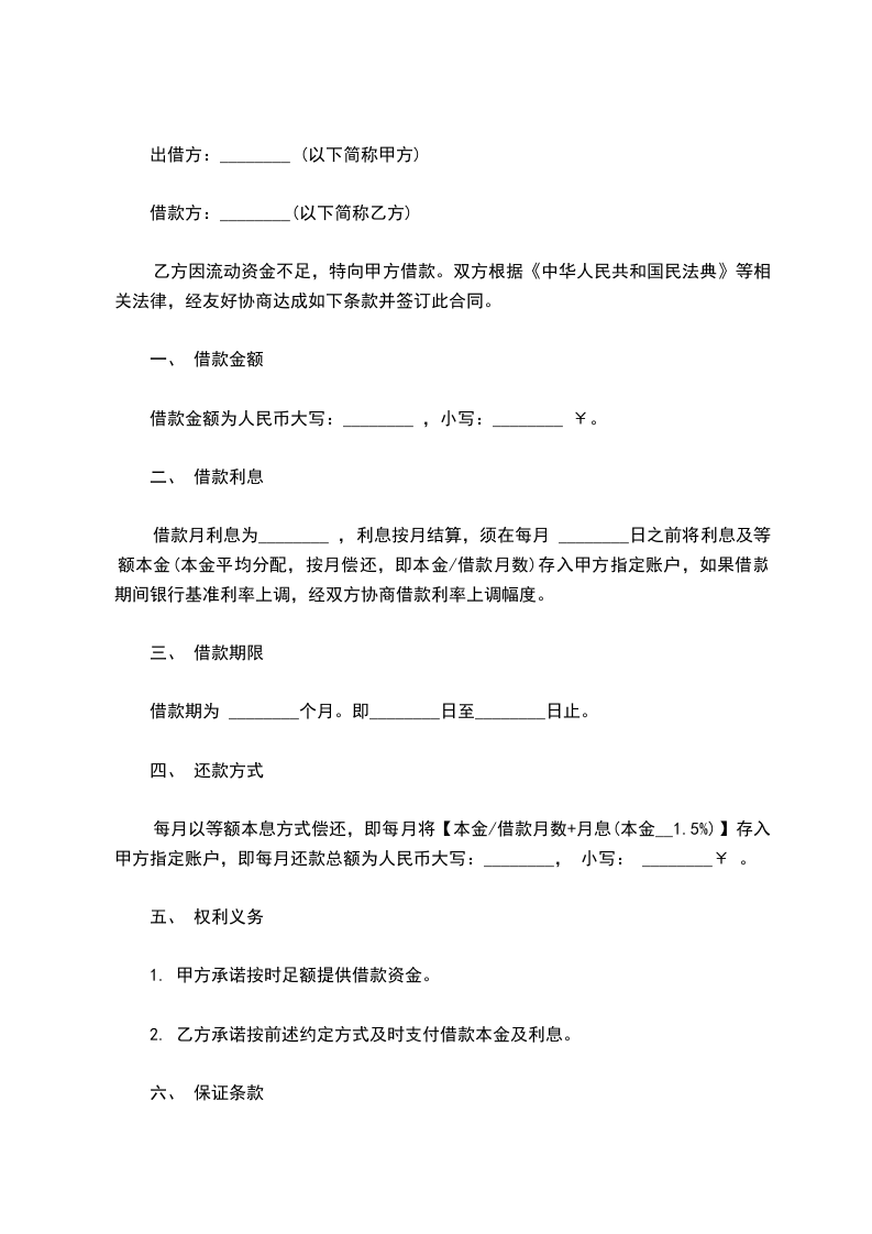一、乙方借给甲方人民币___元(大写:______元整),甲方应于年 月 日前归还完毕。