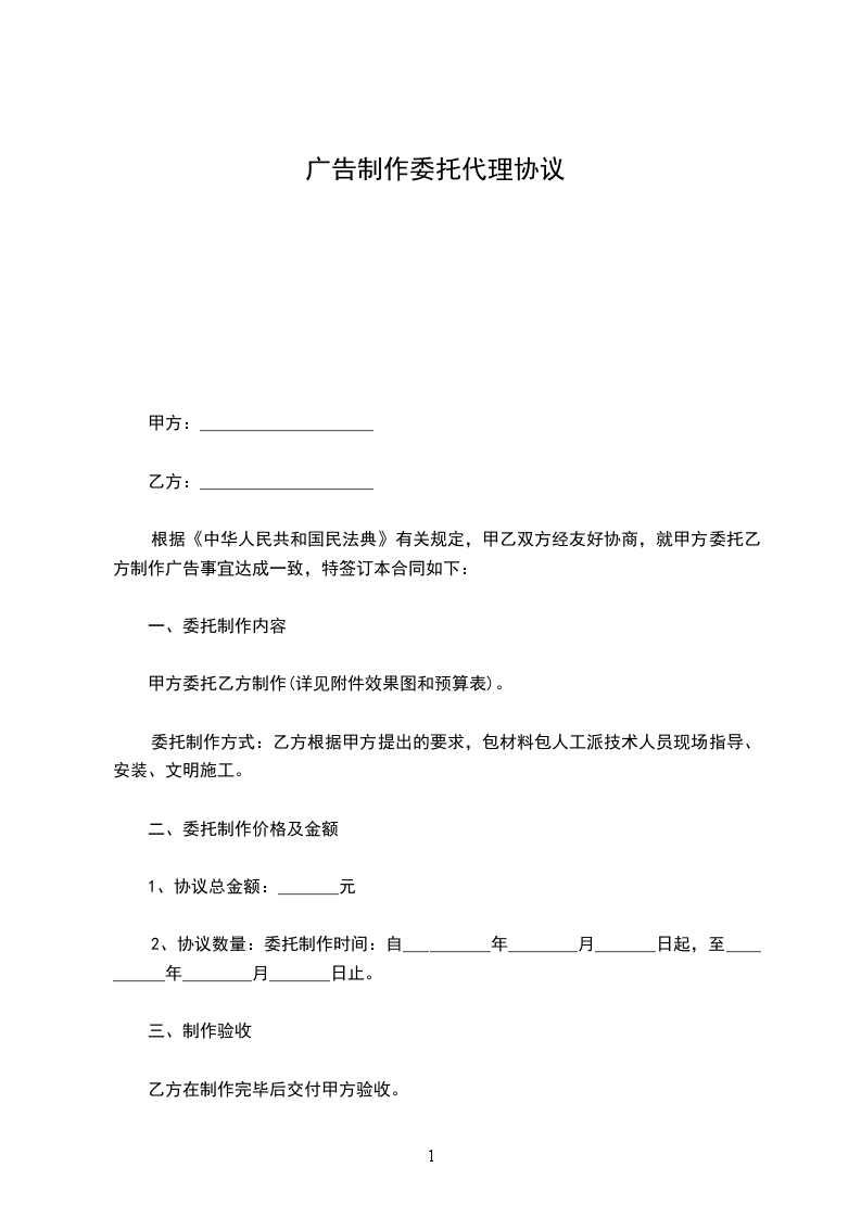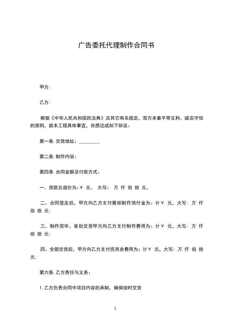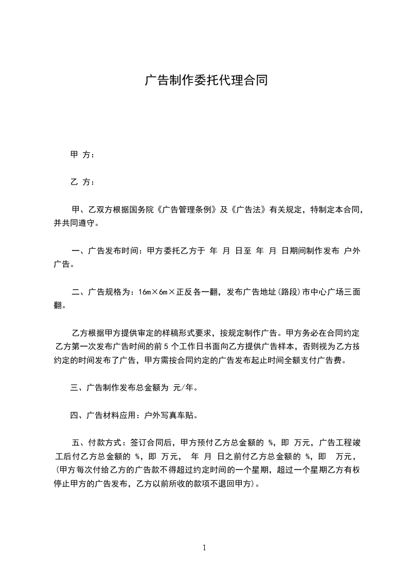 一、广告发布时间:甲方委托乙方于 年 月 日至 年 月 日期间制作发布 户外广告。
