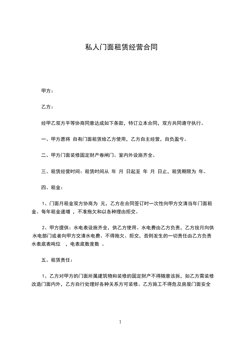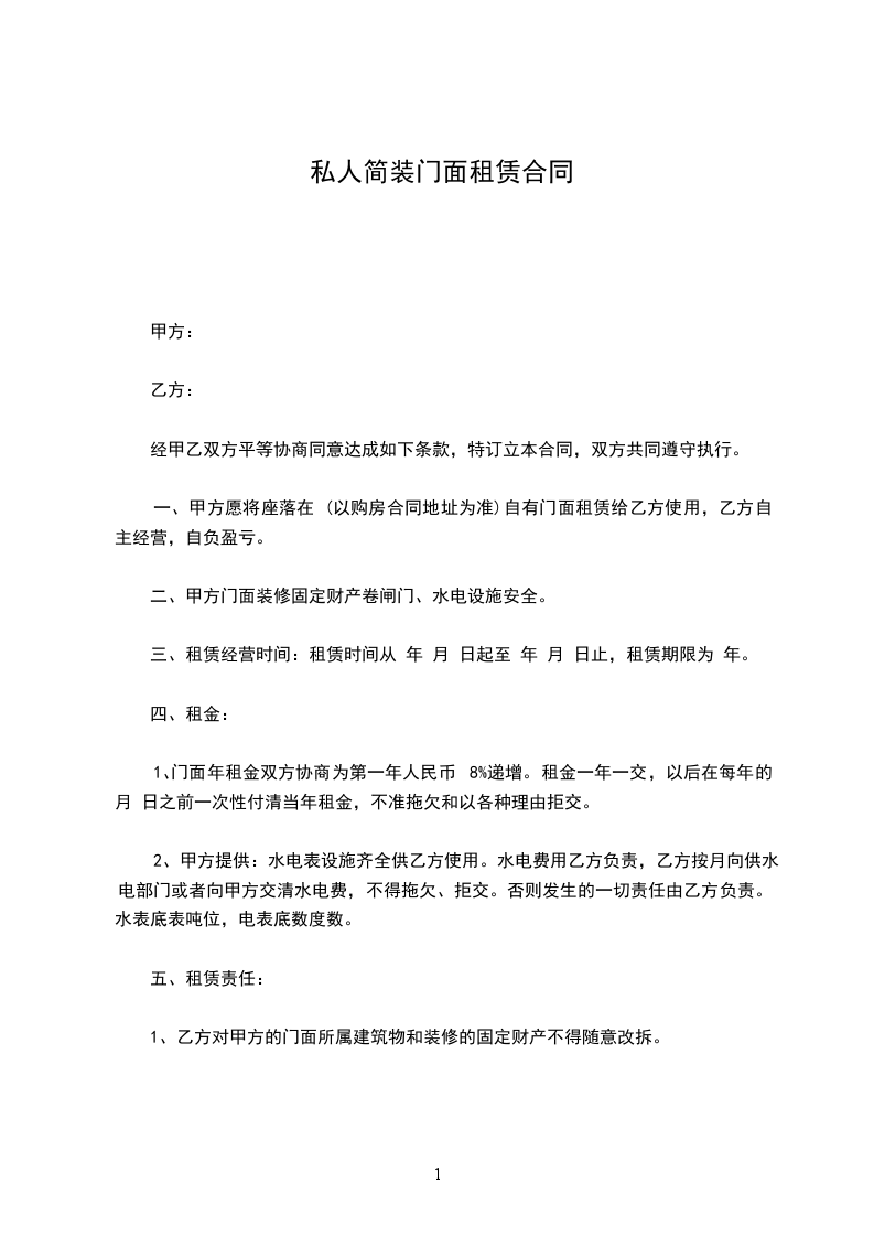 1、租房时间:_____年_____月_____日至_____年_____月_____日止。水费由、方负责,电费单价按供电所收费单据平均价计,租房_____元。由乙方一次性付清。