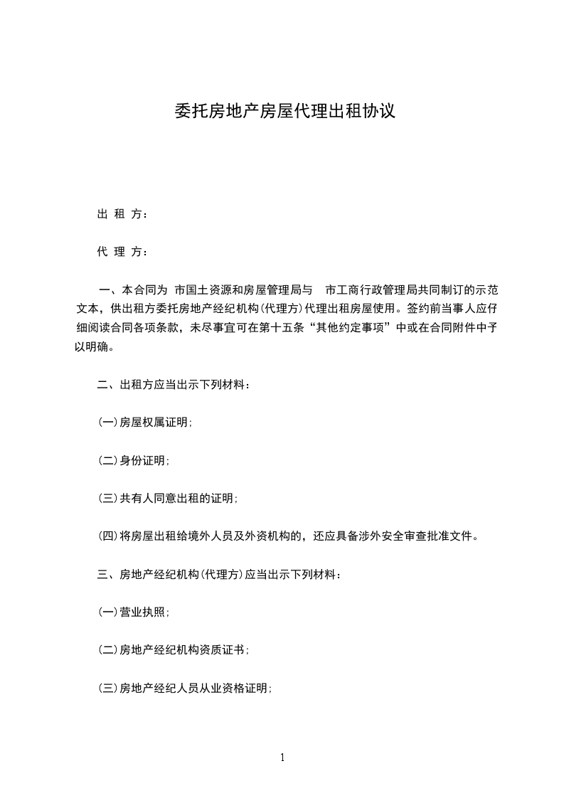一、本合同为 市国土资源和房屋管理局与 市工商行政管理局共同制订的示范文本,供出租方委托房地产经纪机构(代理方)代理出租房屋使用。签约前当事人应仔细阅读合同各项条款,未尽事宜可在第十五条“其他约定事项”中或在合同附件中予以明确。