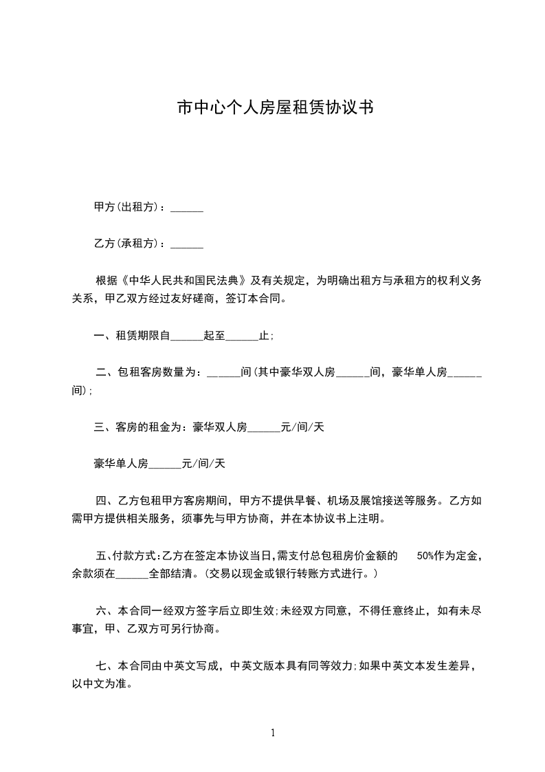 二、包租客房数量为:______间(其中豪华双人房______间,豪华单人房______间);