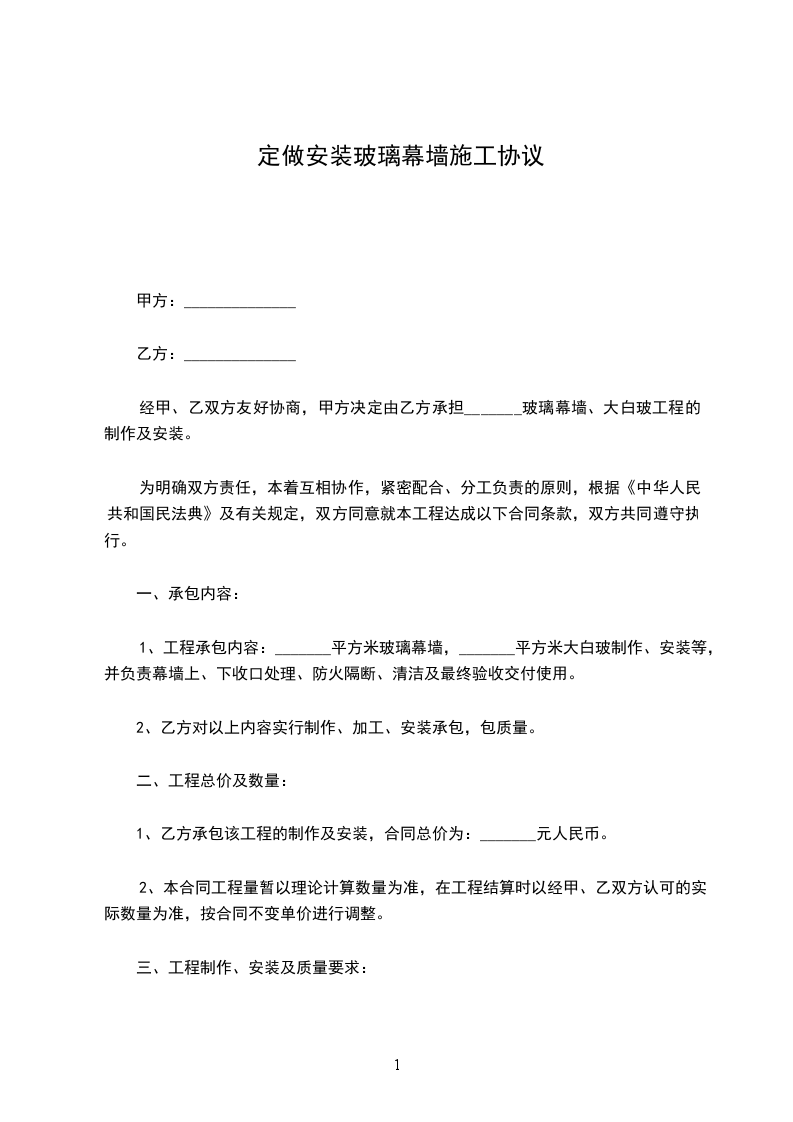 1、工程承包内容:_______平方米玻璃幕墙,_______平方米大白玻制作、安装等,并负责幕墙上、下收口处理、防火隔断、清洁及最终验收交付使用。