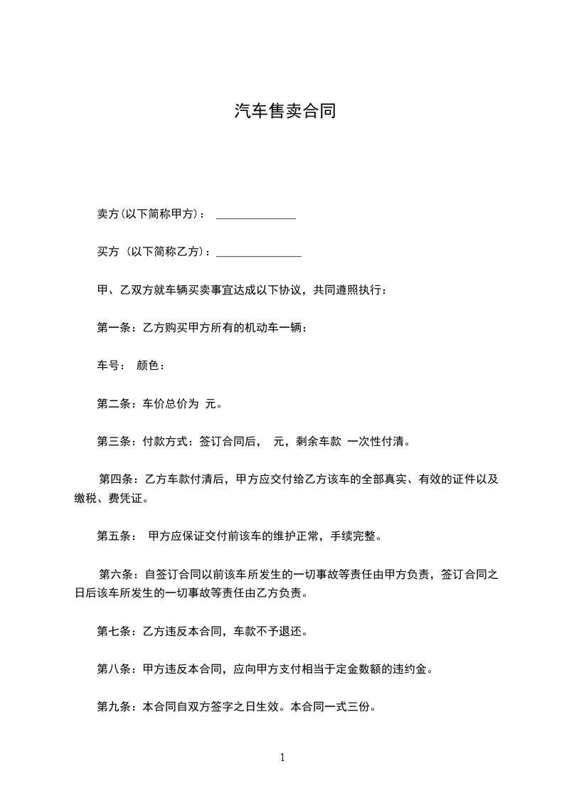 第一条:乙方购买甲方所有的机动车一辆: