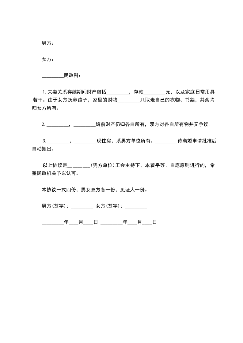以上协议是_________(男方单位)工会主持下,本着平等、自愿原则进行的,希望民政机关予以认可。