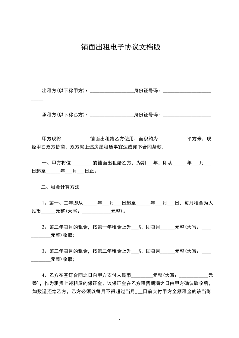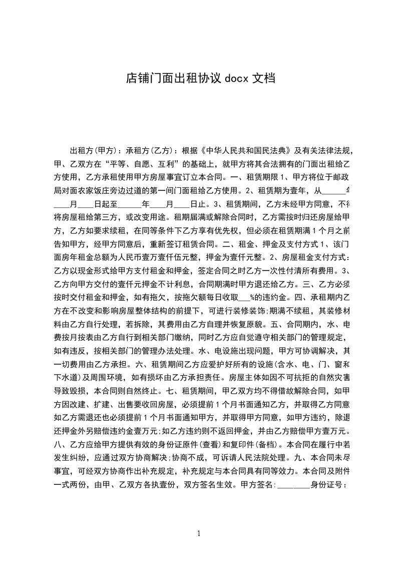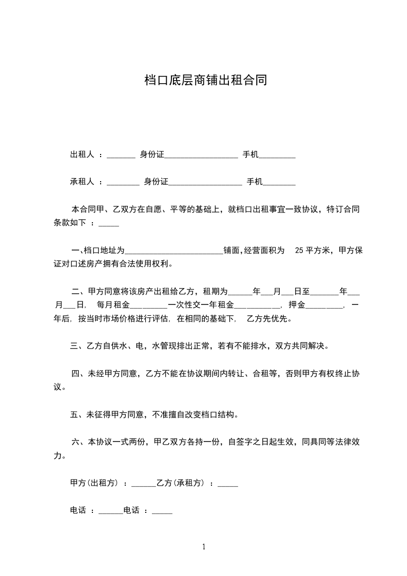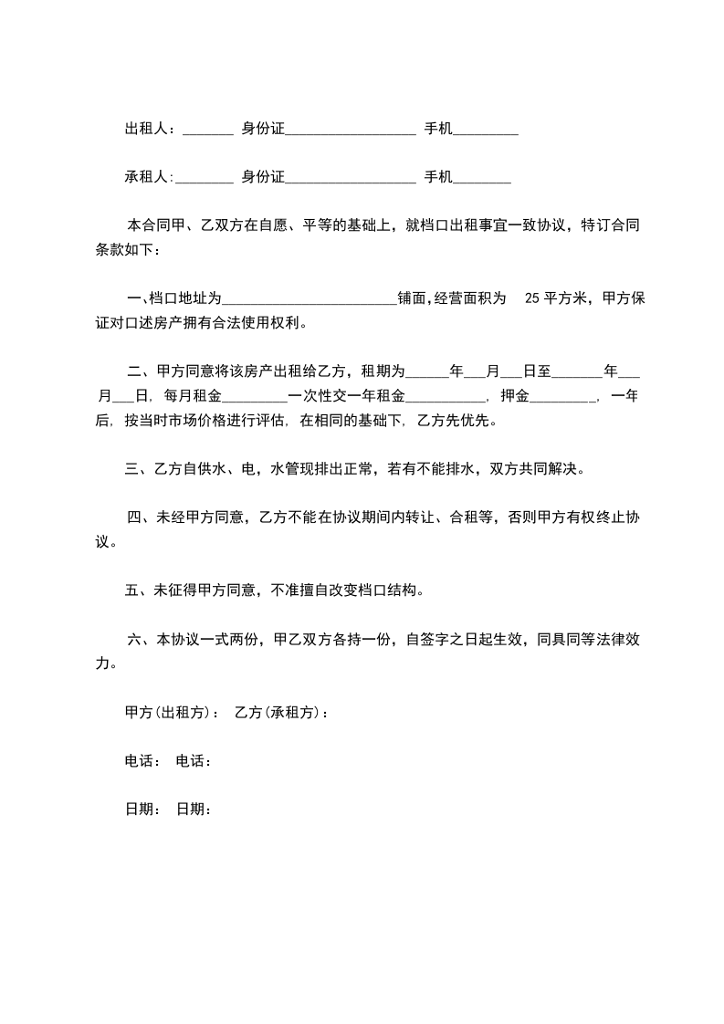 出租人:_______ 身份证__________________ 手机_________