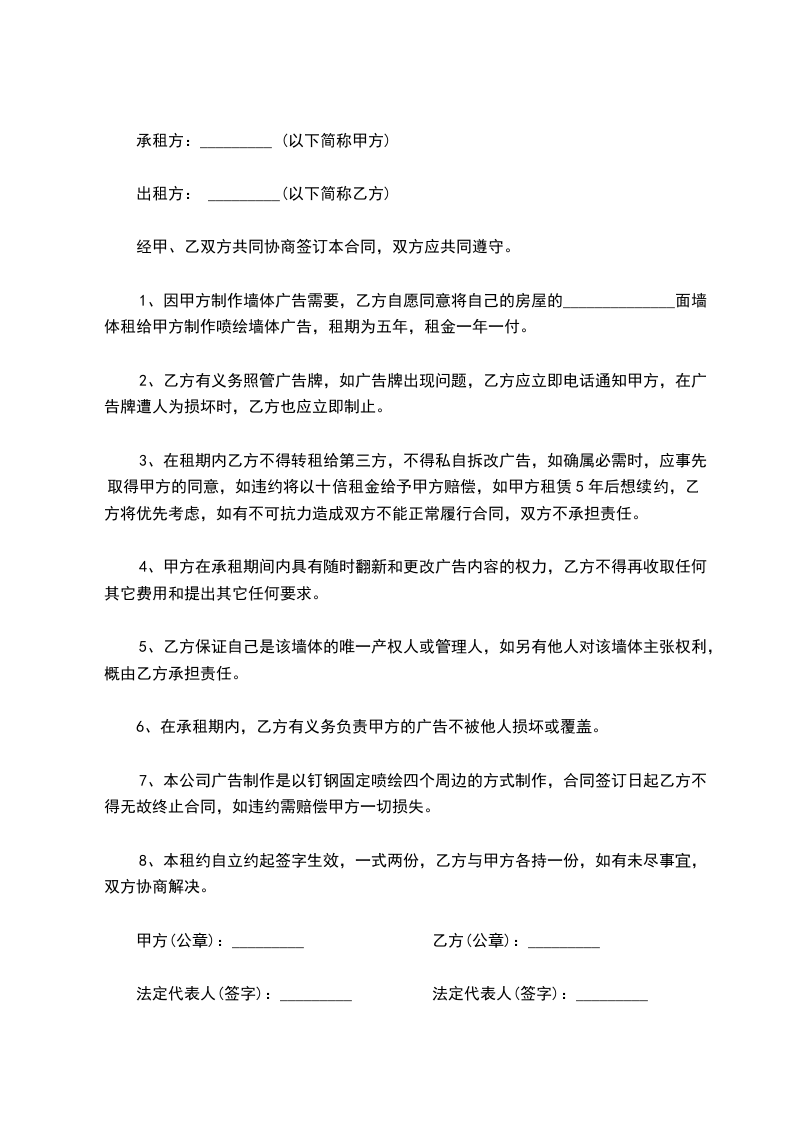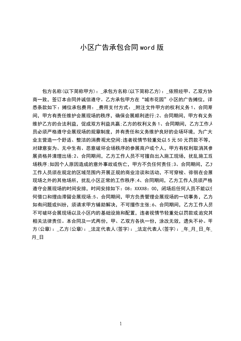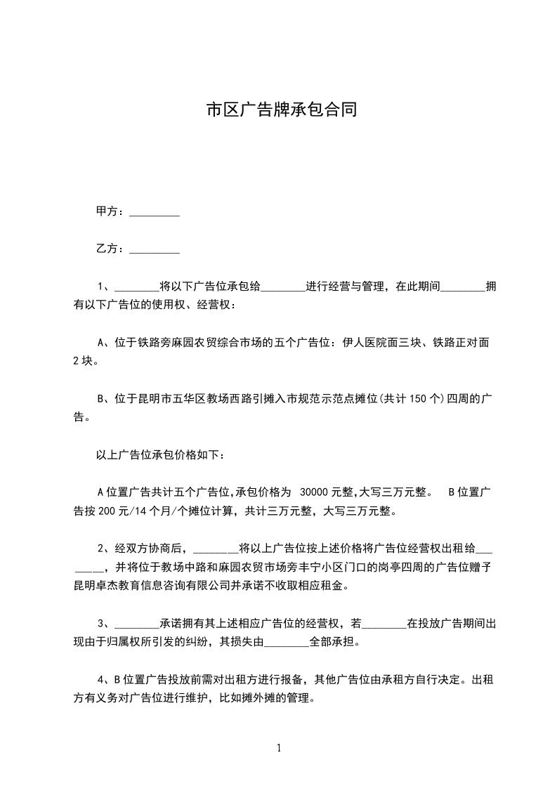 6、小区内其他任何形式的广告位都应由乙方代理,未经乙方同意,甲方不得在本小区范围内放置任何其它商家的任何形式的广告。