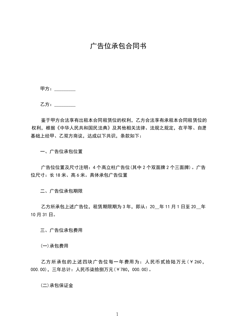 依照《中华人民共和国民法典》经甲乙双方协商一致,签订合同并诚信遵守。乙方承包甲方(梗壁新村)的广告推位,详细条款如下: