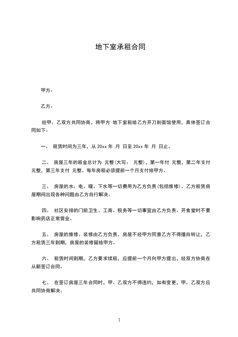 经甲、乙双方共同协商,将甲方 地下室租给乙方开刀削面馆使用,具体签订合同如下:
