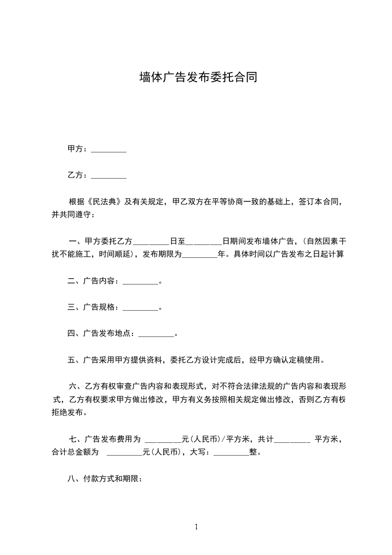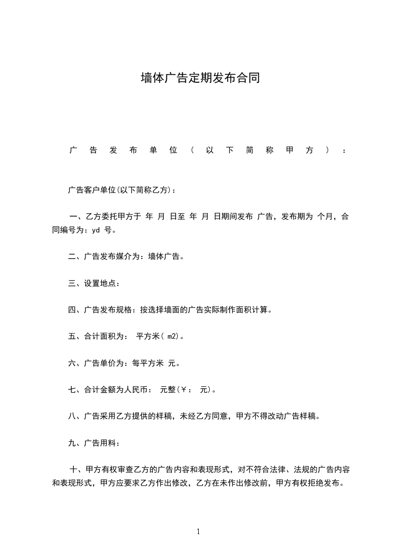 一、乙方委托甲方于 年 月 日至 年 月 日期间发布 广告,发布期为 个月,合同编号为:yd 号。
