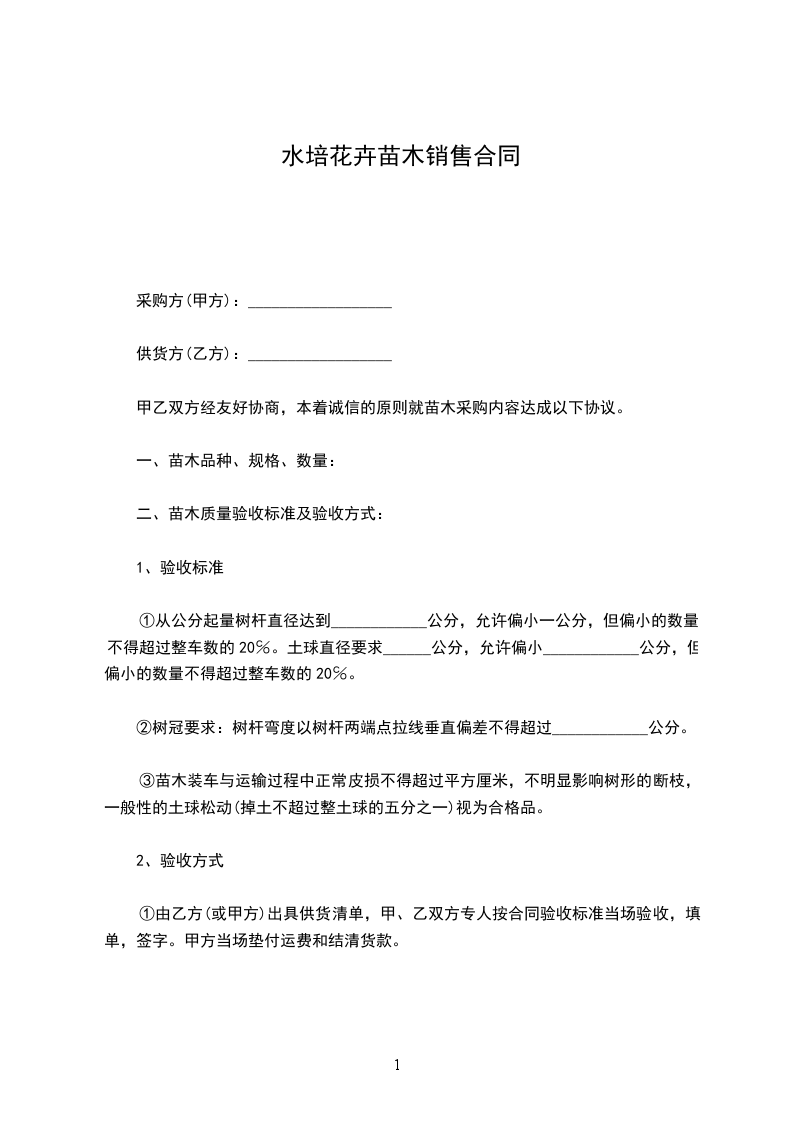 2、甲方采用预付定金的方式,在签订本合同后支付_____元作为购苗定金,余款在乙方将合同内所有苗木花卉拉至收苗现场后____日内付清。