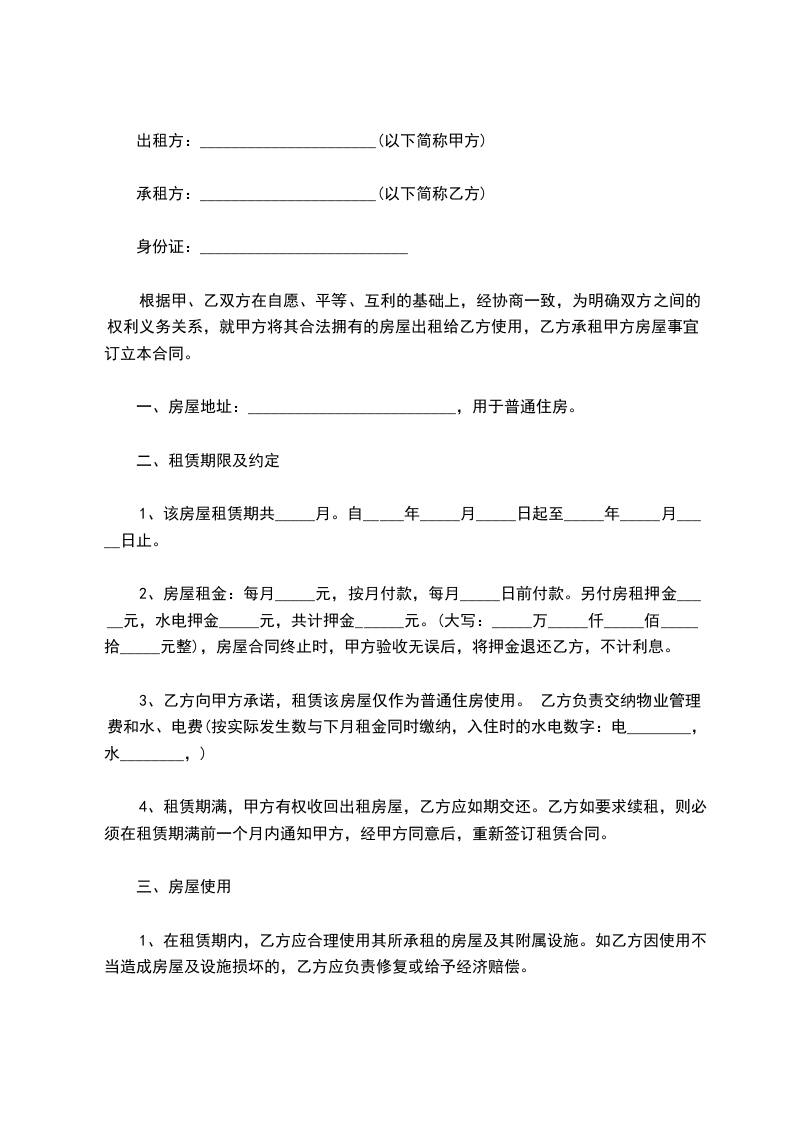3、乙方向甲方承诺,租赁该房屋仅作为普通住房使用。 乙方负责交纳物业管理费和水、电费(按实际发生数与下月租金同时缴纳,入住时的水电数字:电________,水________,)