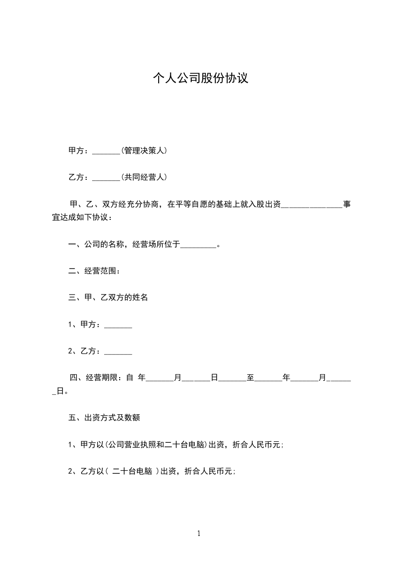 1、甲方以(公司营业执照和二十台电脑)出资,折合人民币_____元;
