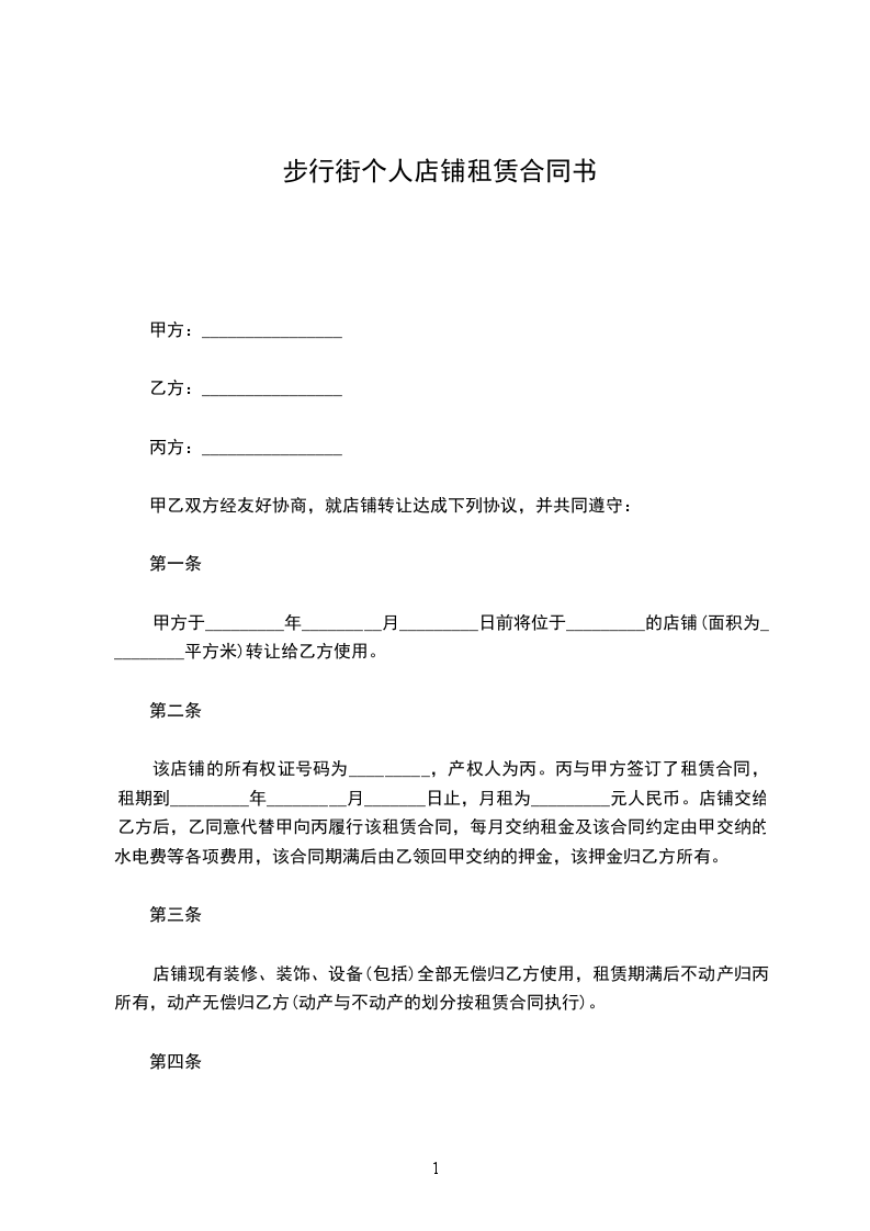 该店铺的所有权证号码为_________,产权人为丙。丙与甲方签订了租赁合同,租期到_________年_________月_______日止,月租为_________元人民币。店铺交给乙方后,乙同意代替甲向丙履行该租赁合同,每月交纳租金及该合同约定由甲交纳的水电费等各项费用,该合同期满后由乙领回甲交纳的押金,该押金归乙方所有。