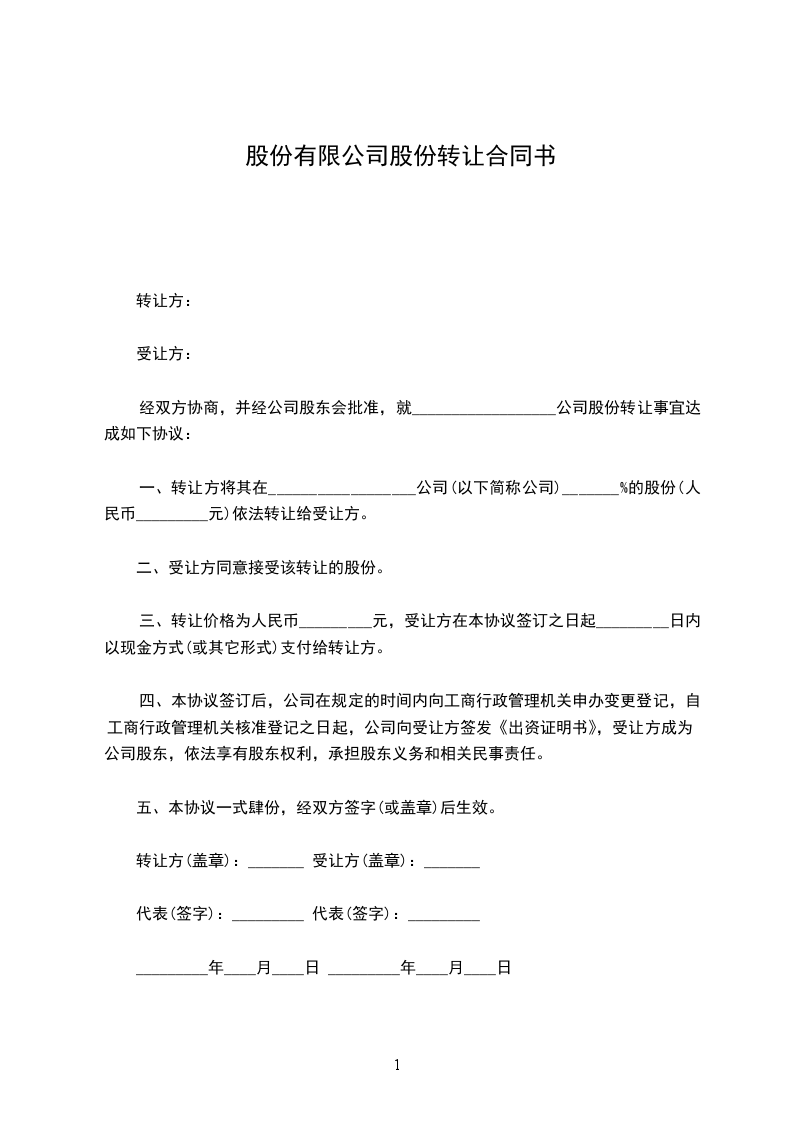 一、转让方将其在__________________公司(以下简称公司)_______%的股份(人民币_________元)依法转让给受让方。