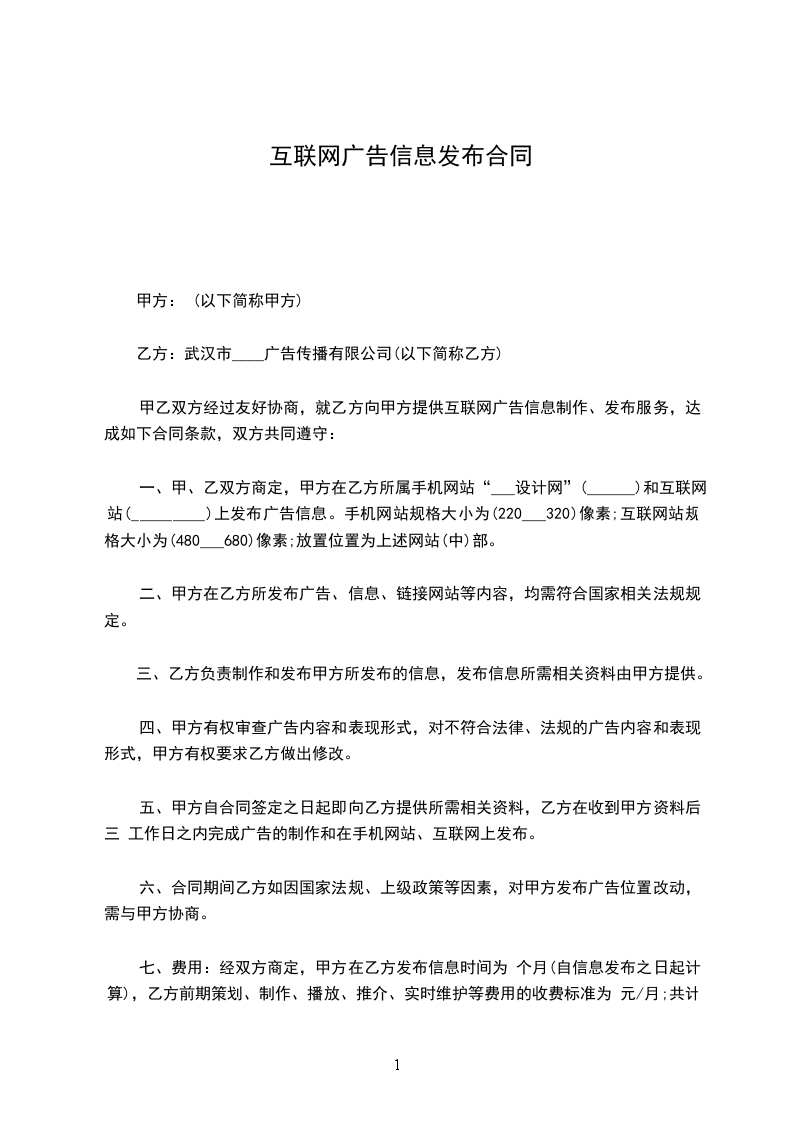 七、费用:经双方商定,甲方在乙方发布信息时间为 个月(自信息发布之日起计算),乙方前期策划、制作、播放、推介、实时维护等费用的收费标准为 元/月;共计 元(大写 万元整 )。 八、付款方式:甲方需在广告发布五日内将广告制作及发布费用汇至乙方账户。
